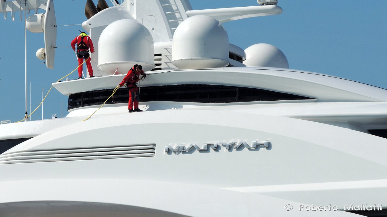 Yacht photographer, Roberto Malfatti, has sent us the video and photos of the outstanding 120m (410’) mega yacht MARYAH (Project Czar), spotted while being anchored in the Port of Livorno in Italy, a fantastic Mediterranean yacht charter destination. Currently the 15th largest yacht in the world, luxury motor yacht MARYAH was originally launched as former Russian research vessel by the Szczecinska yard in Poland in 1991, and rebuilt by the Greek shipyard Elefsis to a design by H2 Yacht Design.