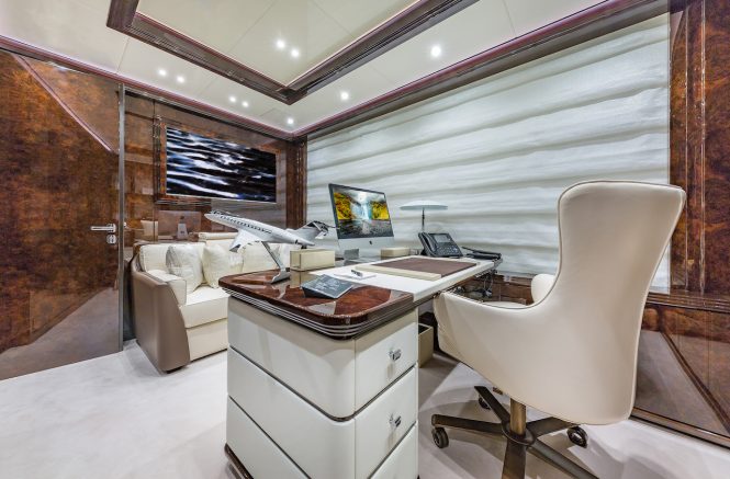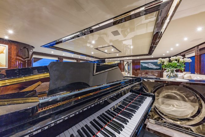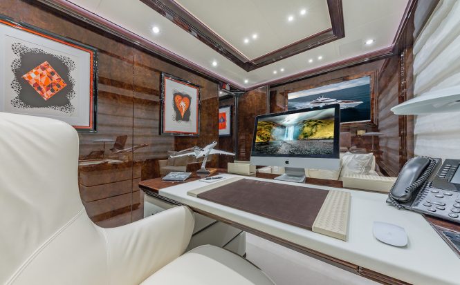 The upper deck hosts a skylounge furnished with two TVs measuring 75″ and 49″ with independent audio systems. A matrix manages everything and allows for multiple configurations for parties, corporate events and more. European and American HD channels can be accessed via the Sea Tel 100 TV HD satellite dishes, meaning there is no need for LNB replacement when changing hemisphere.