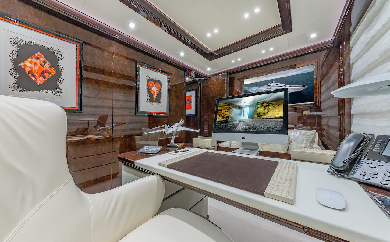 Home Automation: The LED lighting inside and out is managed through the Crestron keyboards and DALI protocol, which have customised silk-screen buttons. Itworks, sister company to Videoworks, created a customised software to control the lights and save new configurations and settings. The crew is privy to a ‘secret’ procedure that restores the original settings.