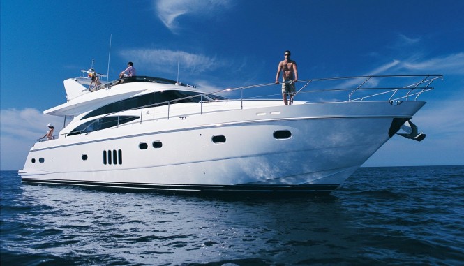The centerline helm of the Viking 70 Yacht provides superb visibility for the operator and there is a raised sunpad aft with storage below. The teak aft deck is ideal for relaxing, while port and starboard steps flanking the cockpit area lead to the integrated bathing platform for easy boarding and tender access.