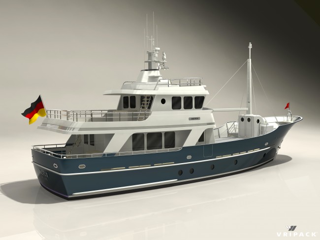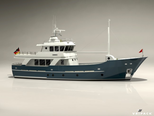 The Vripack Research Vessel 78’ is an azimuth propelled, displacement type, ocean going motor yacht with high flared bow and curved transom. This bruiser has a steel hull with an aluminum superstructure and is very suitable for sailing in the Northern regions like the Baltic Sea and the North Atlantic. The most important features of this design are the seaworthiness, safety and reliability to which Vripack pays a lot of attention since 1961. The yacht will be designed and constructed in a manner fit for her intended use and she will be able to safely roam the seas in all loading conditions. The intention is that the yacht is going to be used as a luxury private yacht for worldwide deep sea cruising. All systems, equipment and outfitting will be suitable for such service. Particular care is taken to ensure that she is fit for use in ice cold and steamy hot conditions. All equipment and systems fitted on board will be able to encounter all types of climate conditions. The above mentioned features combined make this motor yacht suitable to cruise all around the world for long periods of time with owner and guests on board.