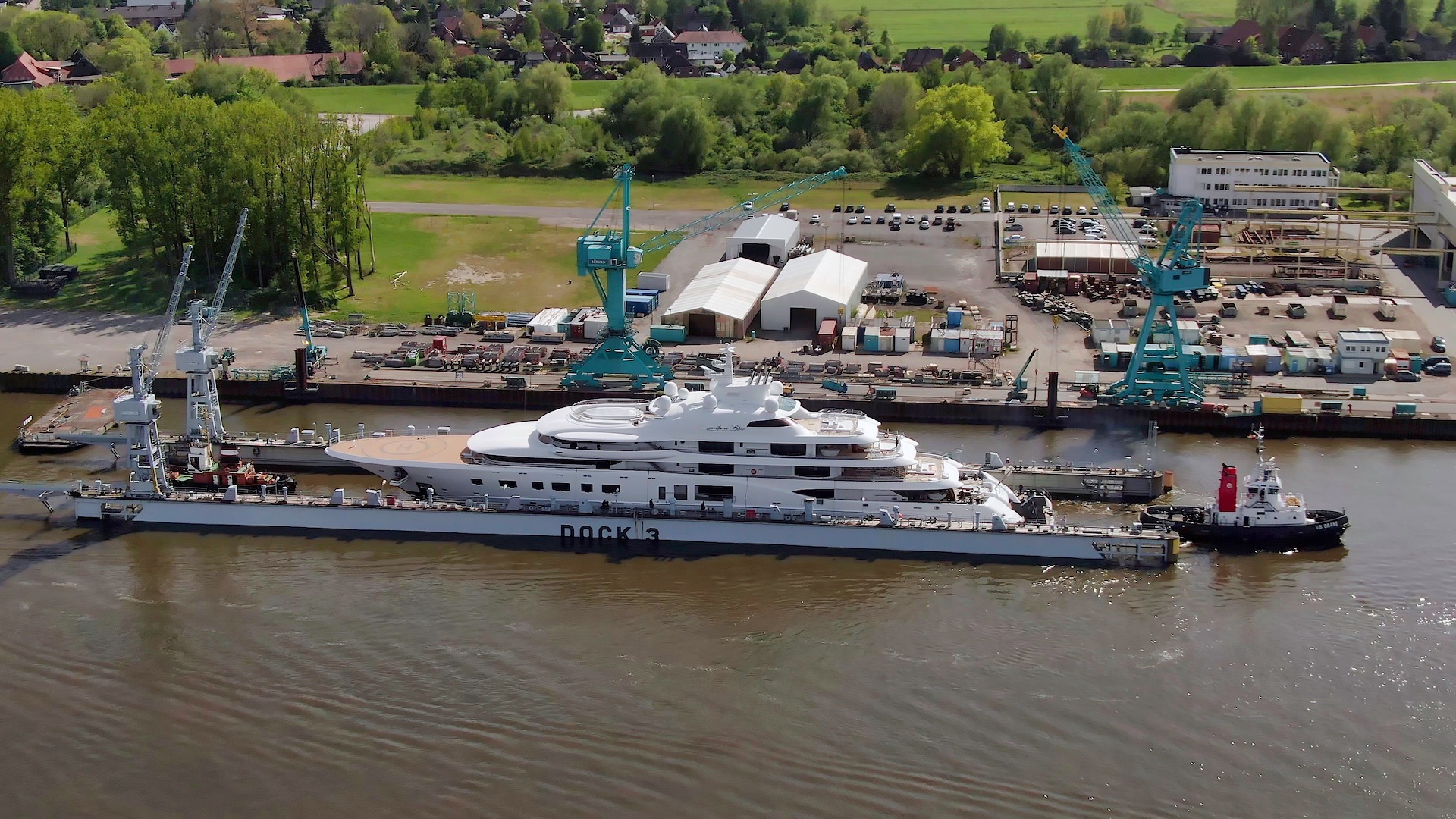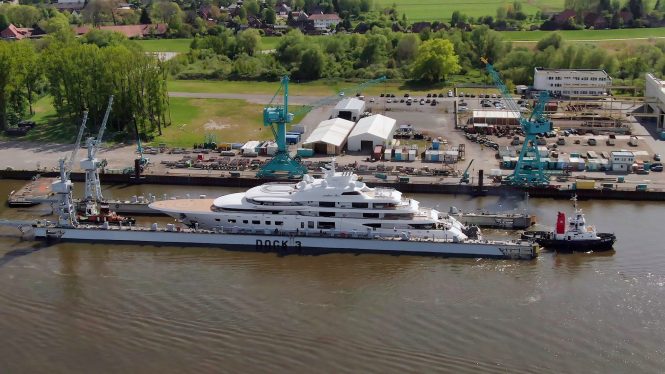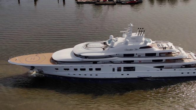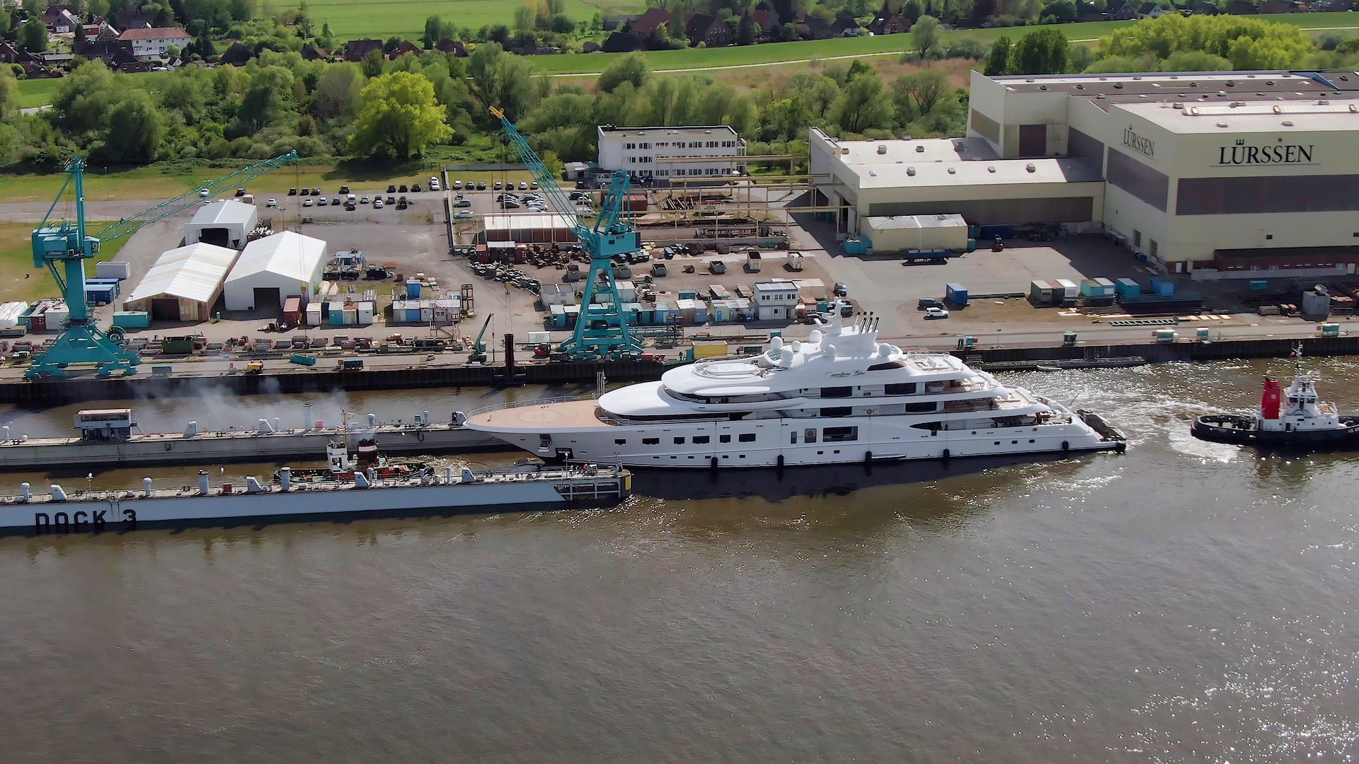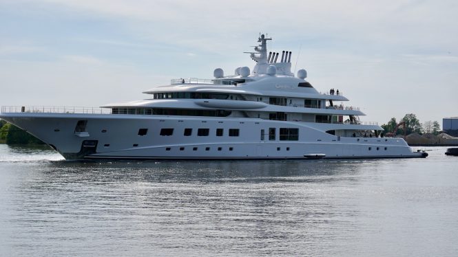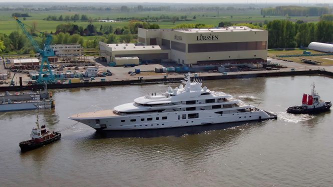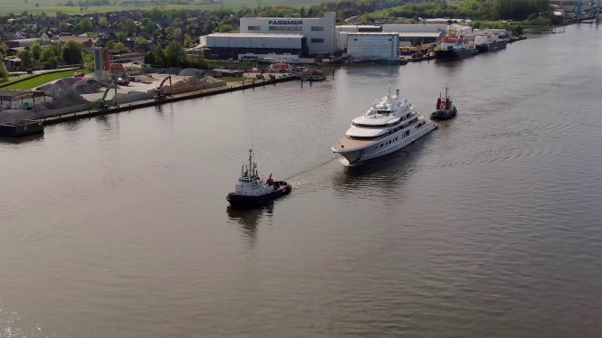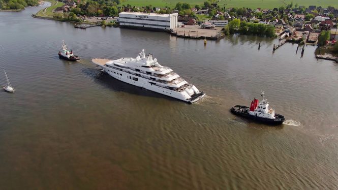 Quantum Blue leaving Lurssen shipyard for the first time since October 2019. Photo credit DrDuu