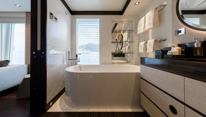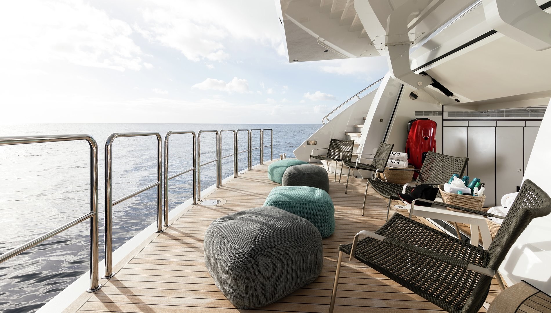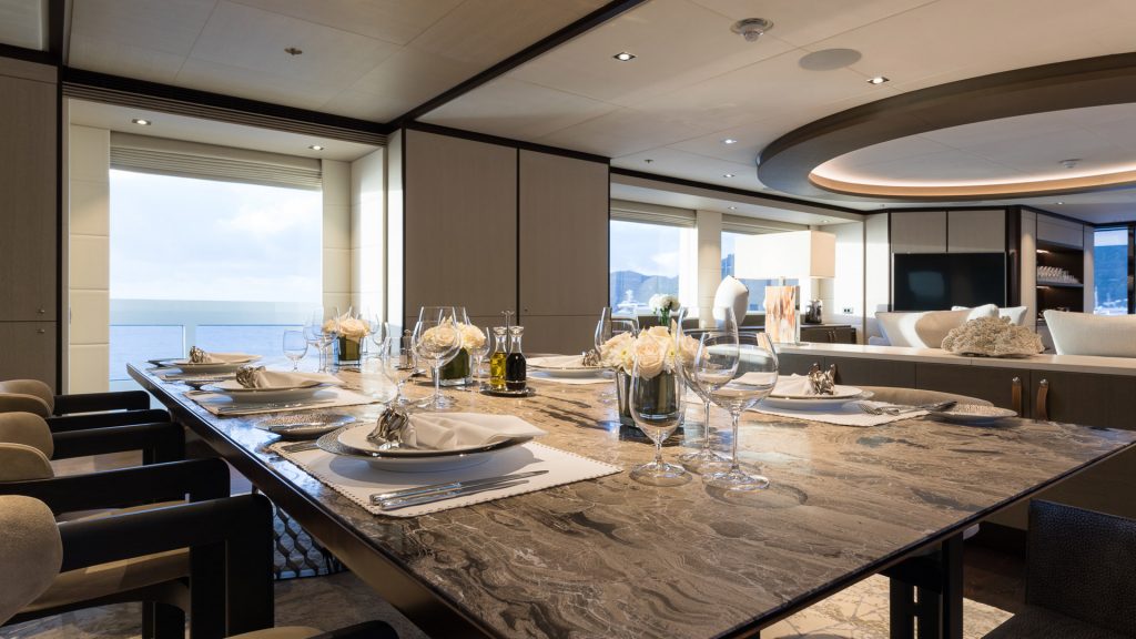 The interior living spaces are styled with soft neutral tones, beautiful furnishing from British and Americal design studios, and rich elements, such as white Arabescato and brown Grecale marble. The ambience onboard is relaxing and inviting. The main deck includes the outdoor area, ideal for alfresco dining and worshipping the sun. The sky lounge was designed for entertainment and get-togethers for an aperitif before dinner.