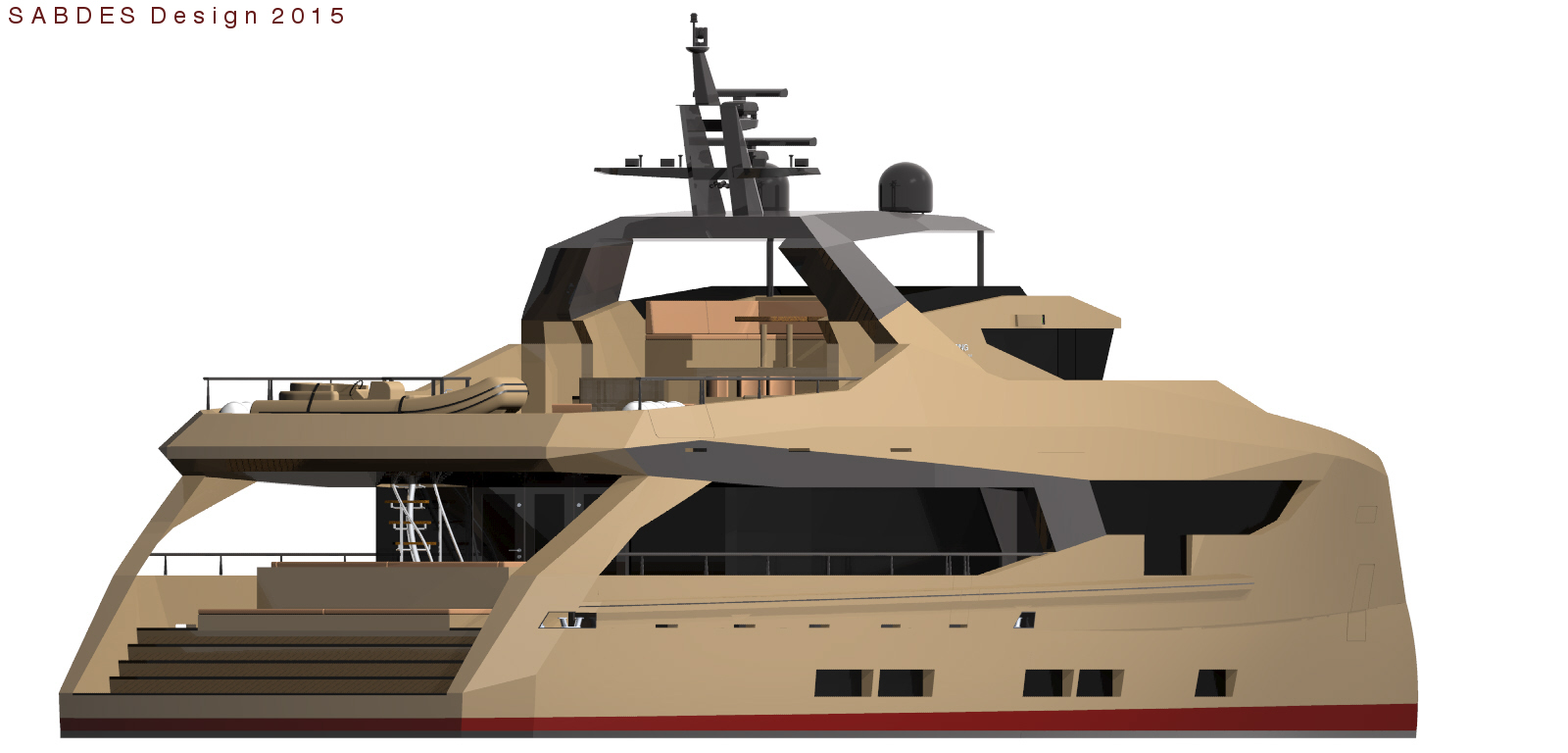 The 33,5m SABDES superyacht design is being developed on a semi displacement hull form with maximum cruising speed of 18 knots. The styling of the vessel features militaristic cues with ‘faceted’ surfacing, which also helps to simplify her building.