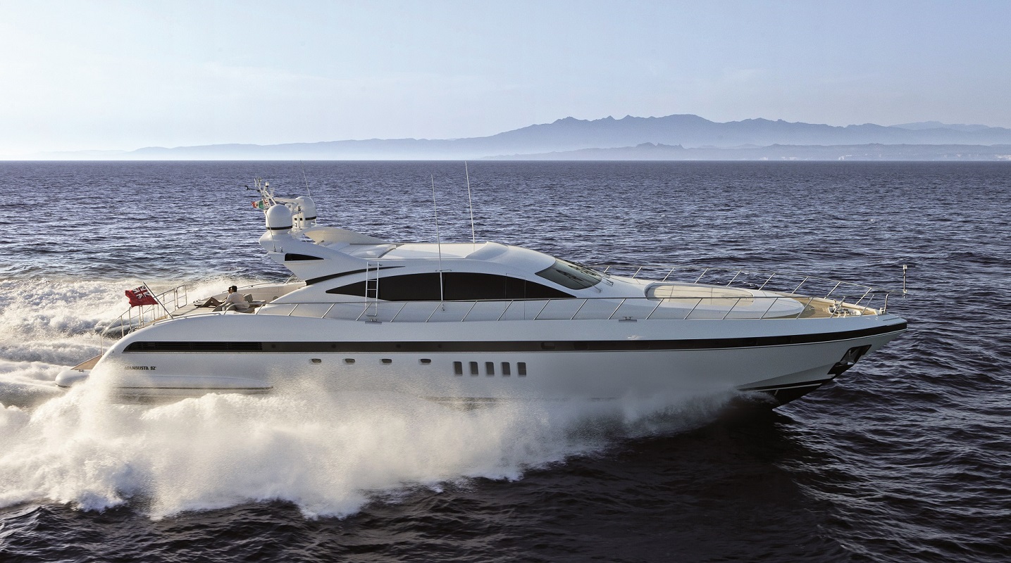 The Mangusta (Overmarine) is a sleek designed yacht, she boasts impressive speeds of 30 knots cruising and 40 knots maximum, powered by twin MTU engines.