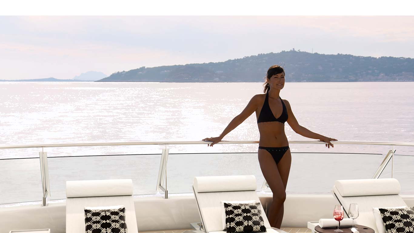 Three deck levels provide plenty of exterior living, making M/Y QUARANTA a great choice for luxury charters. Her aft deck is shaded with seating and boasts a lifting swim platform that can be a teak beach or submerge for easy water access. Forward on this deck, is a large Portuguese bow with 2 alfresco dining tables and built-in seating. There is a well-appointed sundeck, which has chaise loungers, alfresco dining, sun pads, wet bar, Jacuzzi and partial shade.