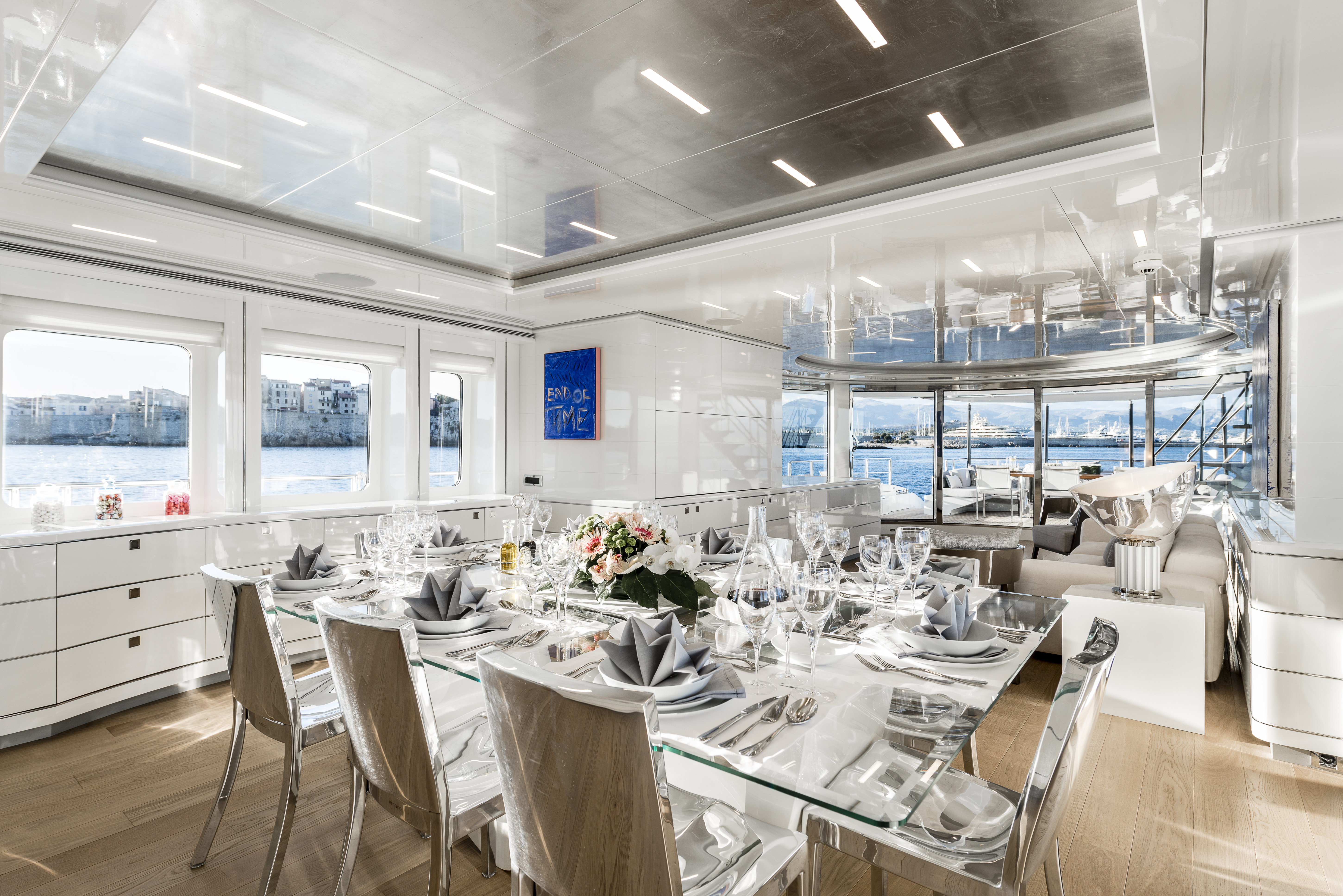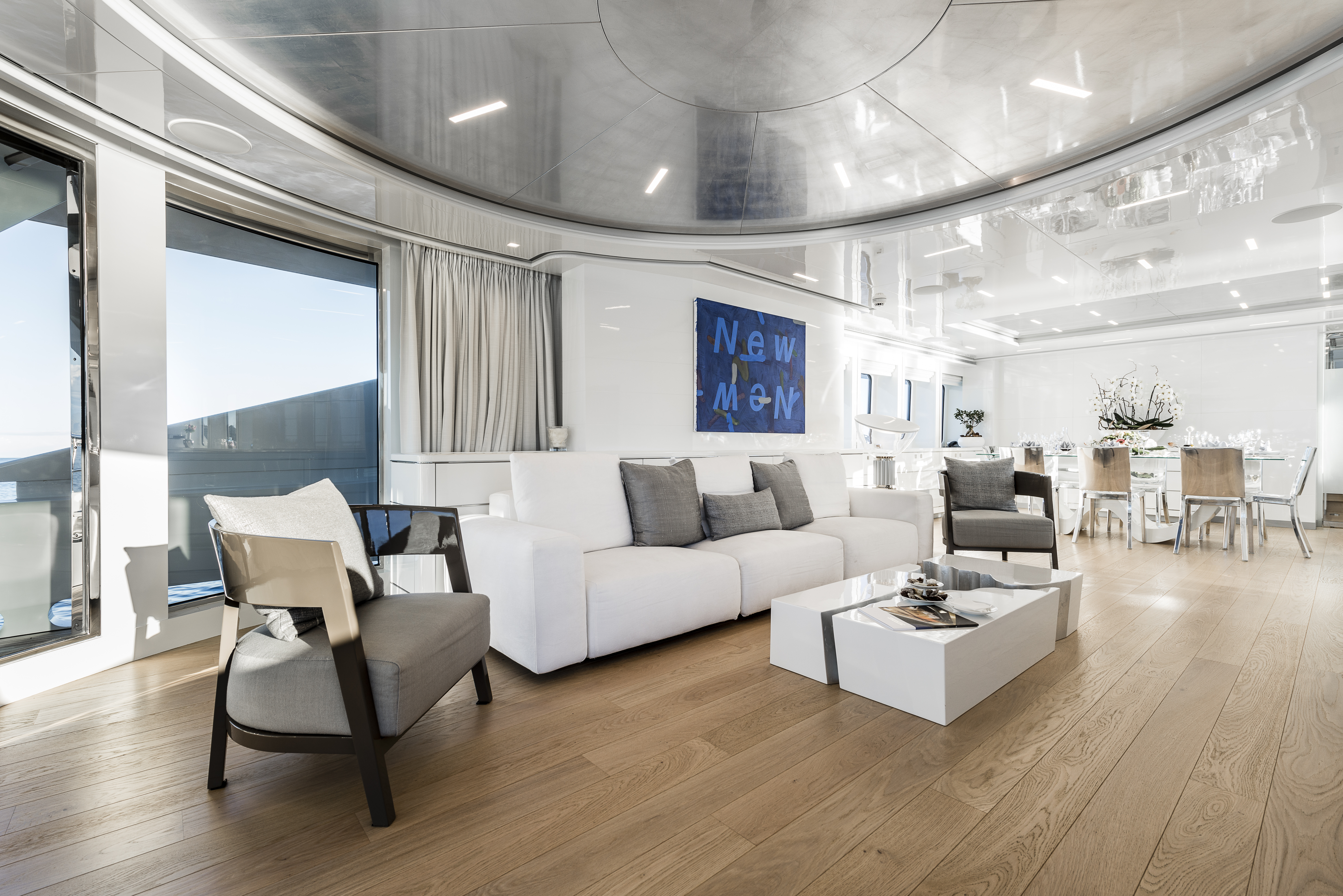 The result is a brilliantly bright interior that takes full advantage of the natural light using reflective metallic and glass surfaces. This effect is particularly distinct in the main salon and dining area, where the vibrant artwork and the warm tones of the wooden flooring integrate perfectly into the design. Laura Pomponi adds to the gallery ambience through the ‘waving’ dining table and ‘glowing’ coffee table in three pieces to catch the eye of charter guests.