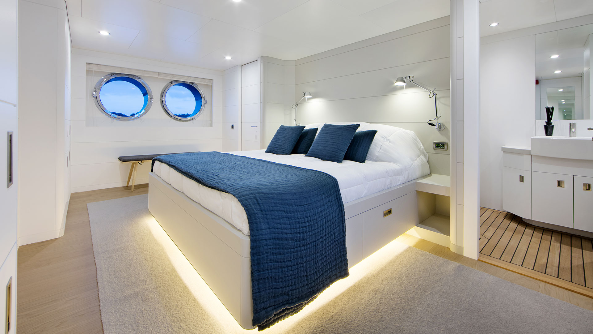 The yacht is equipped with amazing aft deck areas and a vast selection of water toys and various equipments. Her upper deck boasts a huge dining table for al fresco meals as well as large sun pads to relax on. The main deck exterior deck area has further seating and further two tables to dining or enjoy some fresh nibbles and drinks. Here there is also a storage for a tender and a jets, which when the ‘toys’ are launched, the area is set up with sun loungers, chairs and tables to allow guests to relax and enjoy the proximity to the water.
