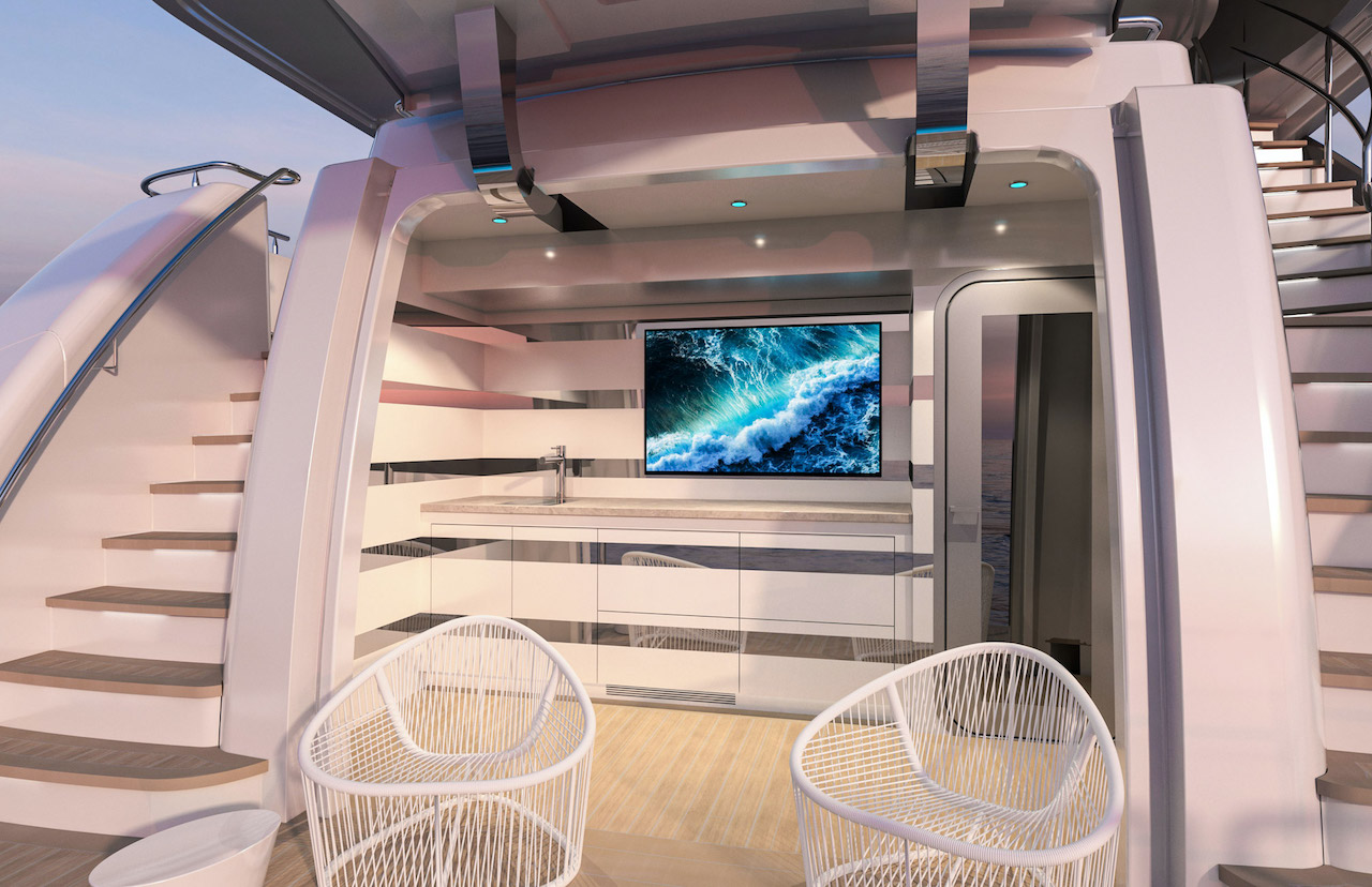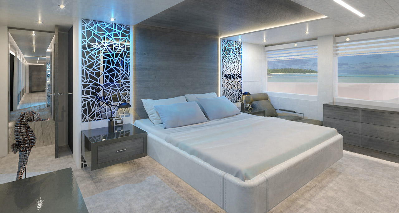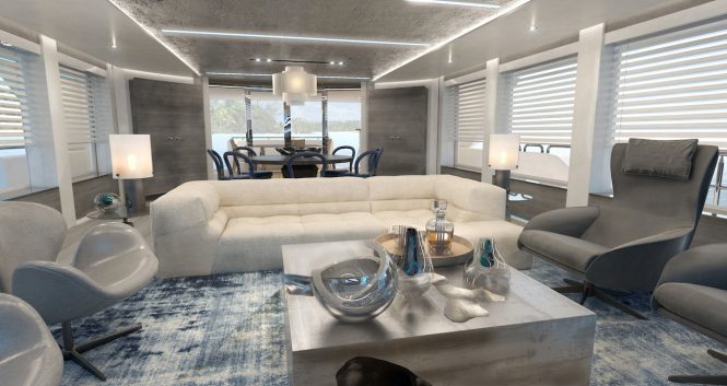 The interiors will feature luxurious elements to create a modern and chic atmosphere onboard. The main salon is an open plan with a beam of 7.2m/23’9″. The formal dining area provides space for up to 8 guests, while an elegant seating area offers plenty of room for socializing.