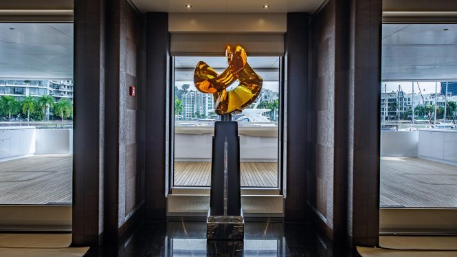When it came to creating the interior layout for WHITE RABBIT, Sam Sorgiovanni had practice with the previous smaller luxury trimaran. Owner Goh Cheng Liang provided a clear brief: The larger vessel was to be used by extended family encompassing multiple generations with the capacity for corporate use. The resulting accommodation sleeps up to 30 guests across 11 en-suite cabins consisting of 2 Master suites, 3 VIP staterooms and 6 other guest cabins. Each family member was consulted for their input on the accommodation and entertaining areas (totalling 1,200m²/12,916ft²), and the response was overwhelmingly ‘more of the same from 61-metre WHITE RABBIT, just on a larger scale’. The art deco styling of the smaller trimaran has also been transferred, albeit in a more subtle fashion, such as the wall sconces and the jellyfish-like light column at the main salon bar.