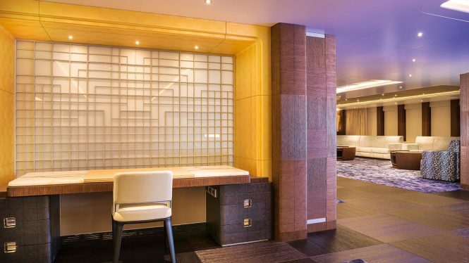 A sweeping staircase leads from the main deck foyer to the upper deck, where the skylounge has a more cosy and intimate atmosphere after the expansive main salon. This media-focused room is furnished with a karaoke area and a baby grand piano. The guest accommodation placed upon this level enjoys excellent views through large yet more traditional windows that create a ‘viewing portal’ effect while maintaining guest privacy. Instead of an abundance of wardrobe space, guests have a bench to lay out their belongings, as those on board are expected to spend much of their time in the social areas and at each destination, using their cabins only for rest and the en-suite facilities.
