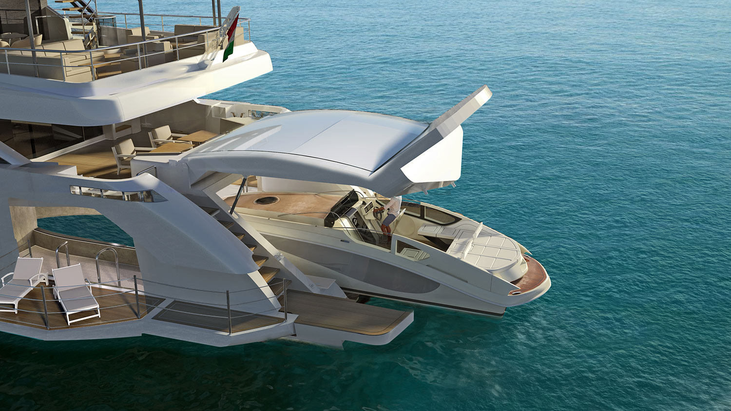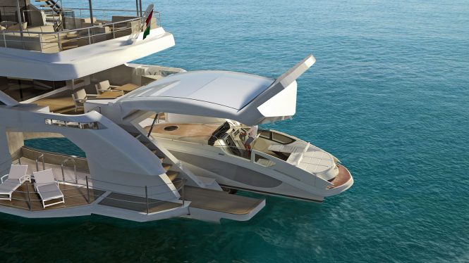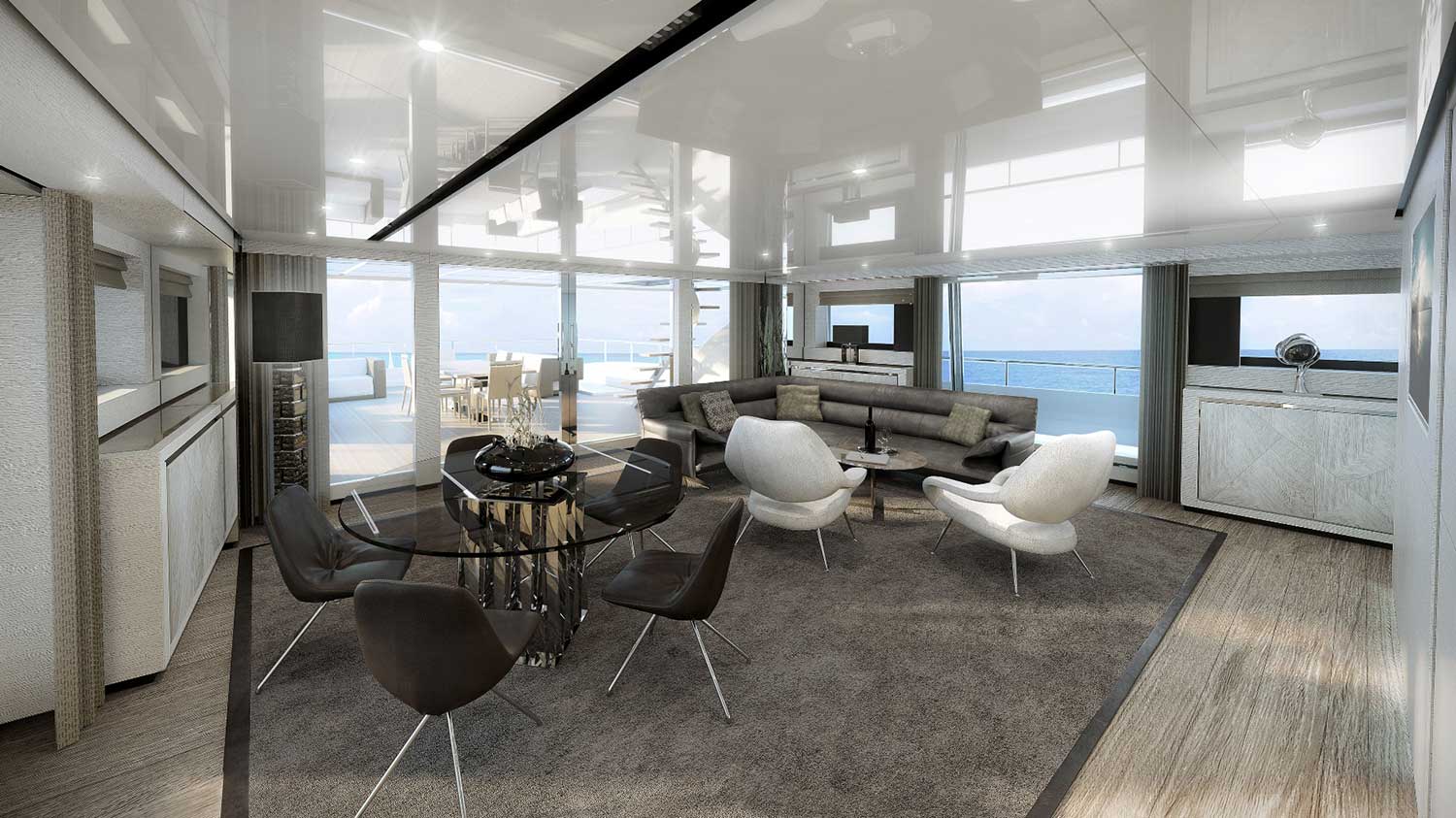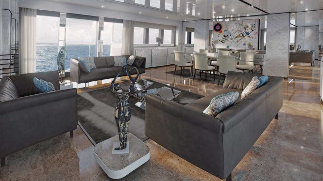The interior decor will use a minimalist monochrome scheme designed for guest comfort and entertaining while enhancing the natural light. There are numerous terraces available to guests on board, extending the area of the main salon, beach club and the Master suite.