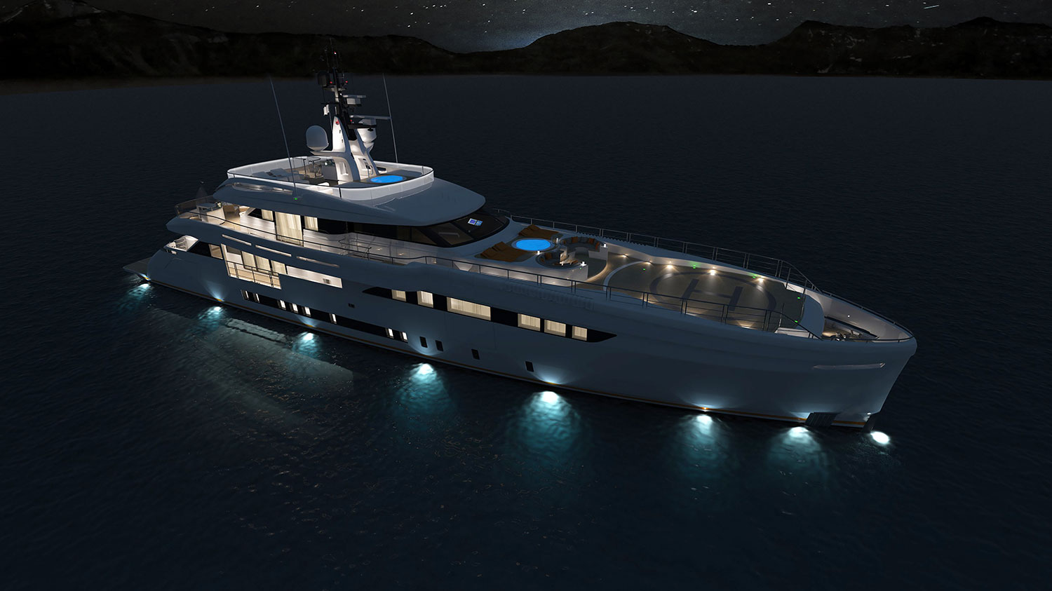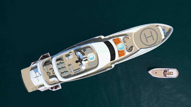 The interiors boast a 7m/23ft pool within the beach club, plus six spacious guest cabins, while the outer 350²m of deck space contains a touch-n’-go helipad. The video shows two Jacuzzis placed on the foredeck and the sundeck respectively, and both come with an assortment of sunpads and a nearby alfresco lounge.
