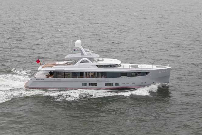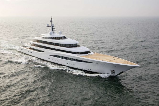 73.4/141ft motor yacht HASNA from Feadship is another family-oriented yacht packed packed with impressive design features and amenities. De Voogt Naval Architects and RWD produced her exterior styling, while the latter also produced her sophisticated interiors that feature a large beach club, a cinema, six cabins for 12 guests and a crew of 21.