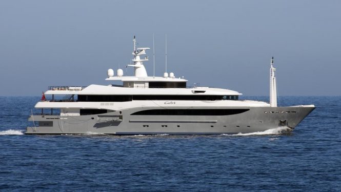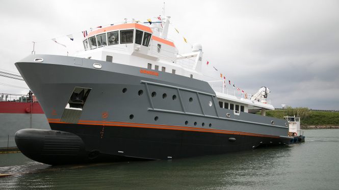 Originally a commercial tug, 40m/131ft motor yacht GENESIA was rebuilt by Cantieri Navali Chioggia after being stripped back to her metal hull. This ‘go-anywhere’ expedition yacht now boasts a gunmetal grey hull, with an orange waterline and white superstructure, while inside the convertible interior can sleep 10-12 guests over five-six cabins.