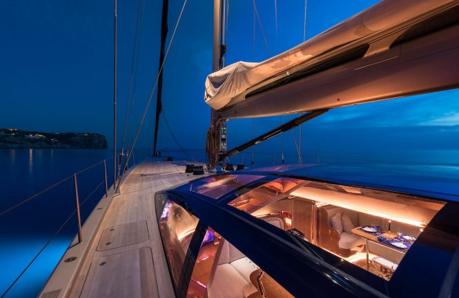 A port boarding platform and a Master suite balcony increase the engineering complexity, and for this reason S/Y PINK GIN beat five other competitors for the Sailing Yacht of the Year award. Her ‘force feedback steering’ power-assisted system is another technological innovation that provides the helmsman information over a wireless link for accurate information on the yacht’s trim and balance.
