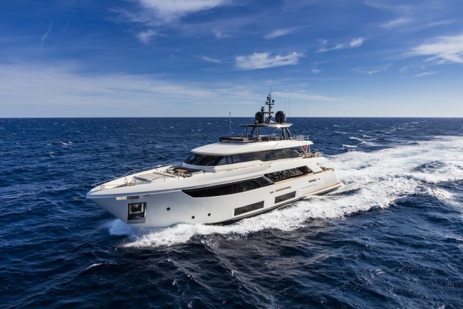Custom Line luxury yacht TELLI is a semi-displacement Navetta 33 series yacht with a sundeck whirlpool, fold-down terraces and sound dampening technology incorporated into the design. The result is a tranquil interior that blends out into the alfresco living spaces to form large guest areas perfect for parties.