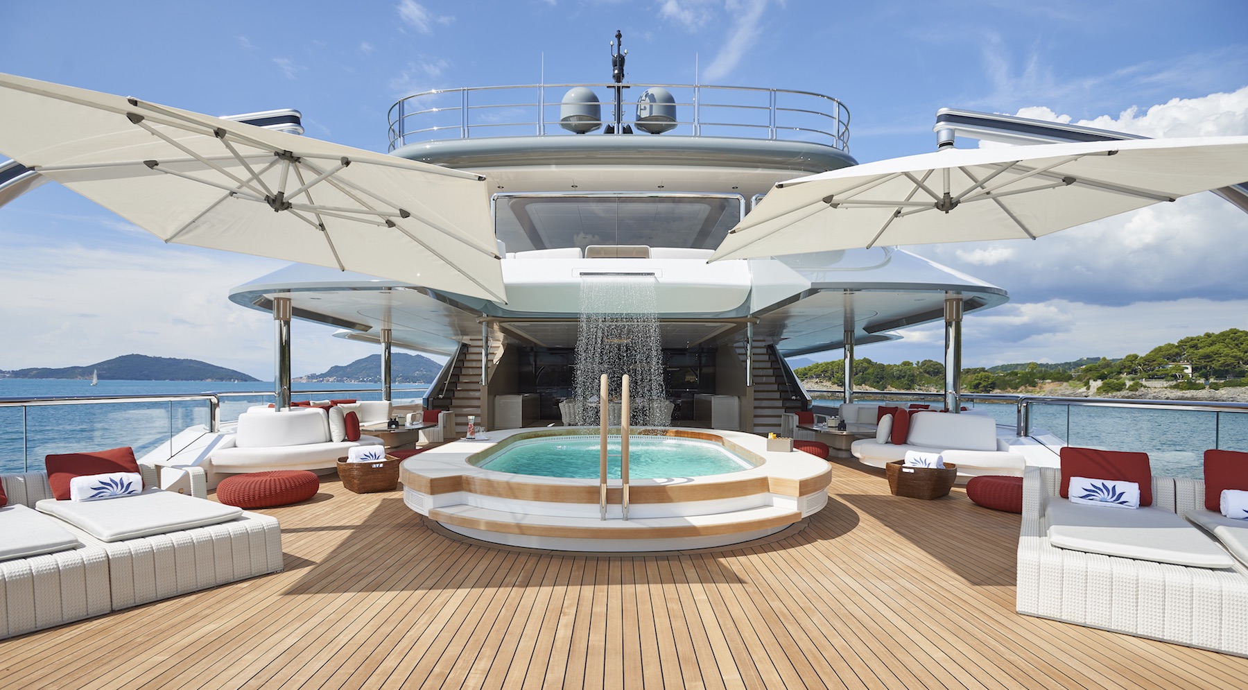 The judges had to choose between six superyachts for the award, of which motor yacht DAR won by a small margin in a secret ballot. Judges were impressed with the exterior styling from Luiz de Basto, where natural flowing lines within the form that earned DAR the name ‘PROJECT SHARK’ while under development. A waterfall from the bridge deck aft feeds into a large swimming pool that is the centrepiece around a sunbathing area. Here, the smart storage solutions allow the sun umbrellas to fold into the bulwarks when not in use. Most notably, nearly 400m²/4305ft² of dark glass covers the superstructure and each panel is 1.8m/5.9ft wide, 3m/9.8ft tall and resistant to rocking in open seas.