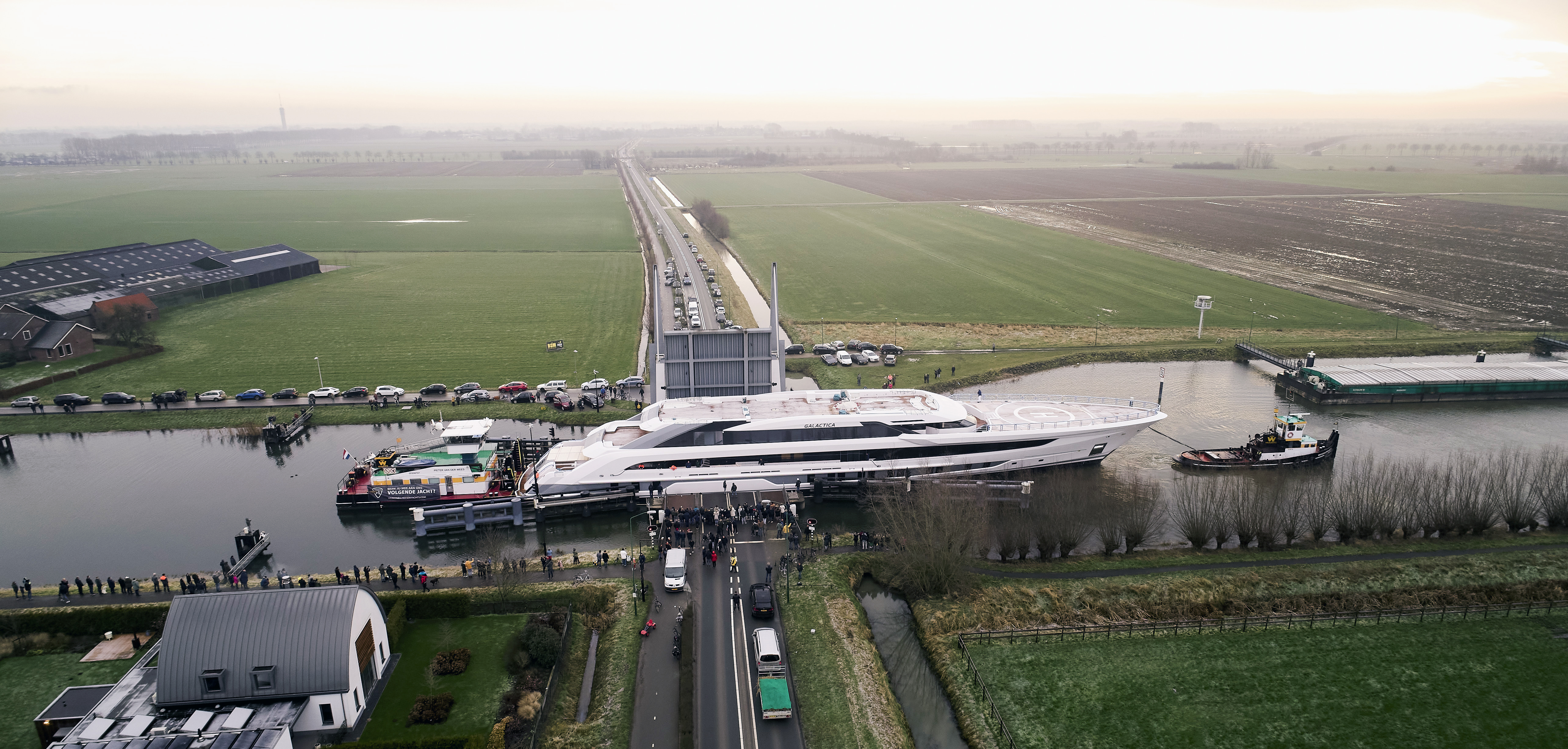 Dutch shipyard Heesen has officially launched the 80m/262.8ft luxury yacht PROJECT COSMOS on 17th December 2021 and was Christened superyacht GALACTICA. She began her maiden voyage in ideal weather conditions, passing through the tight lock-in Macharen on Saturday. With only 15 cm of clearance on each side, she had to wait for a calm day with no wind.