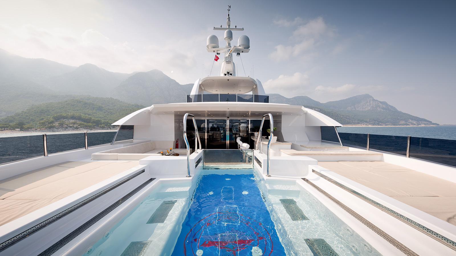 12. IRIMARI – 63m motor yacht IRIMARI is a spectacular vessel, built by the Turkish shipyard Sunrise Yachts, with naval architecture by Unique Yacht Design. Designed by respected Espen Oeino, IRIMARI superyacht boasts beautiful interior by renowned German studio Focus Yacht Design. Top deck pool pictured below.