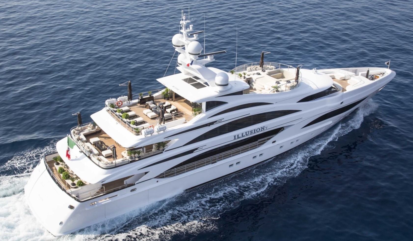 Motor yacht ILLUSION V has exterior 3 decks and a large teak beach, ensuring there is something for every charter guest aboard. Starting on the transom, the teak beach is the ideal launching location for the plethora of water toys on offer. Her main aft deck is shaded with seating situated in a social atmosphere, as well as a small wet bar for that refreshing cocktail, served up by your professional crew. The upper deck is host to a large glass alfresco dining table seating all guests with ease. A sundeck on the Benetti yacht is extremely well-appointed sure to please everyone, it is complete with a wet bar, sun pads, jacuzzi, seating, chaise loungers and alfresco dining, that can be enclosed when requested.