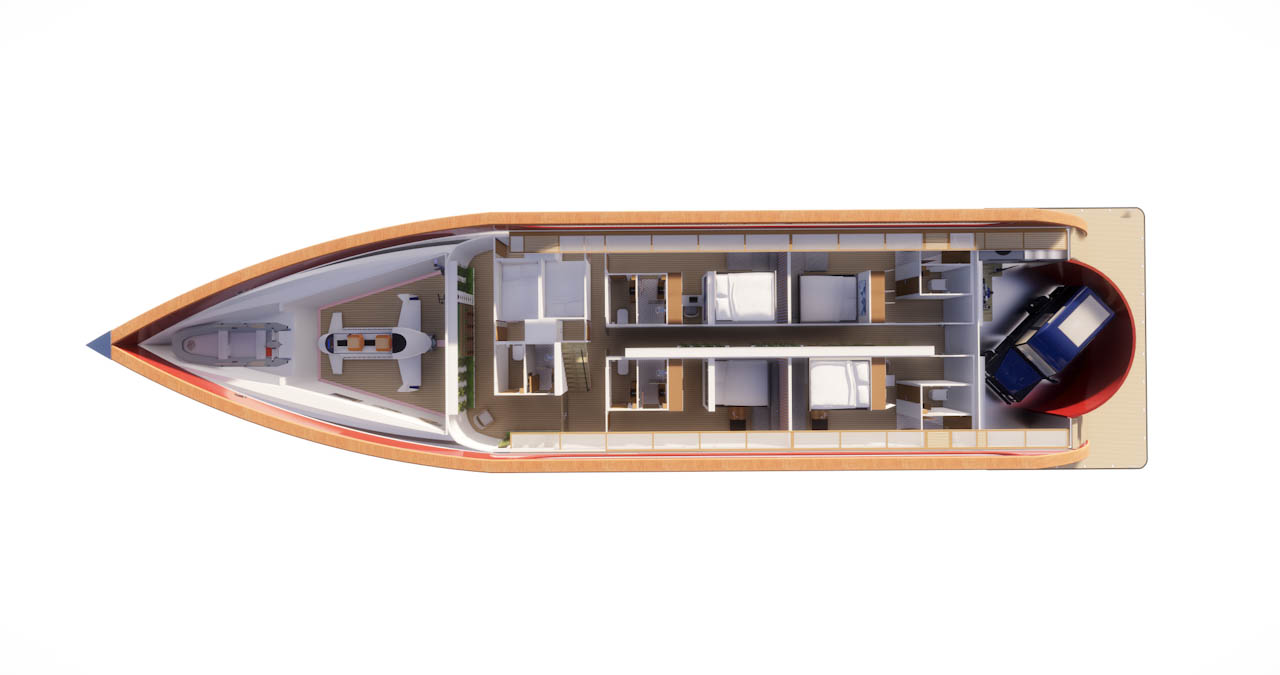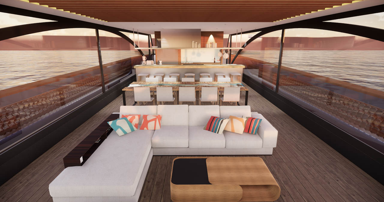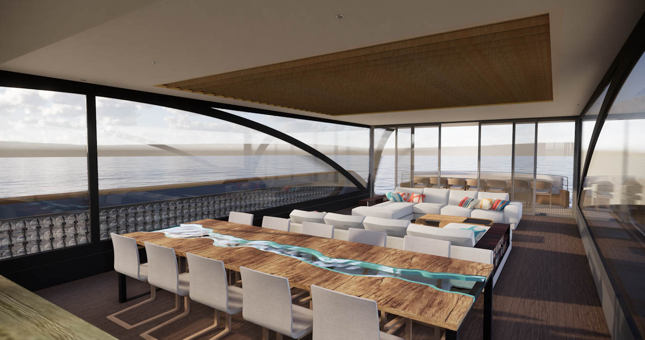The superstructure sitting on top of the deck is a glass box providing a borderless experience with nature. It is open plan with an expanding gallery. The is a seamless link to the navigation cockpit featuring a massive digital map. The glazing is smart glass with captures both thermal radiation and photovoltaic energy. A solar canopy reveals a flybridge that is perfect for entertaining, relaxing in a large solar heated Japanese ‘Ofuru’ style jacuzzi which double has water battery. When underway the water is released through microturbines.