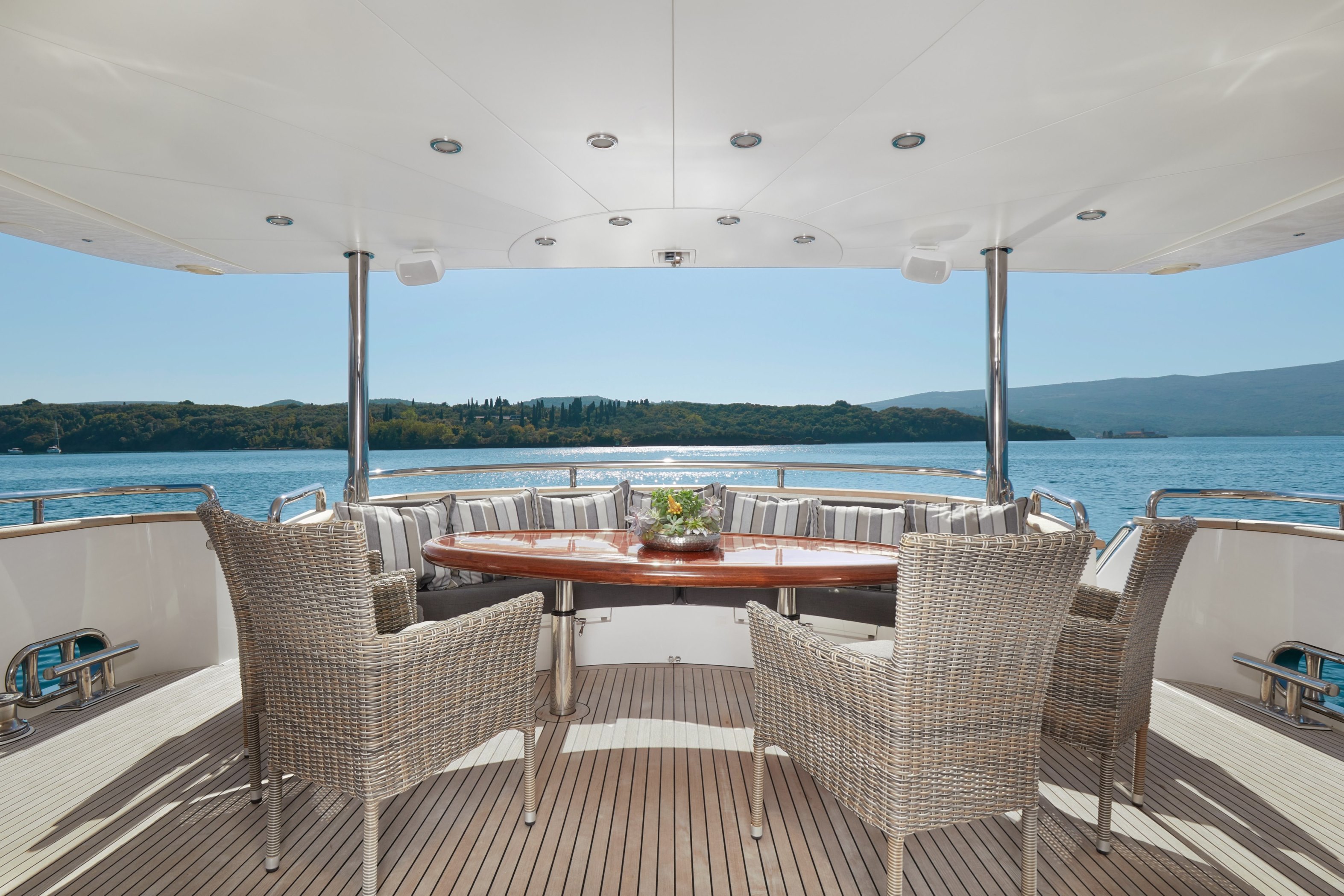Outdoors is just as desirable, with the main deck aft providing a sheltered alfresco dining and social space where the group can feel a greater connection the surrounding locations of the Adriatic Sea. The swim platform below provides a space close to the water for sunbathing, and the railings add a further degree of safety when moving to and from the tender.