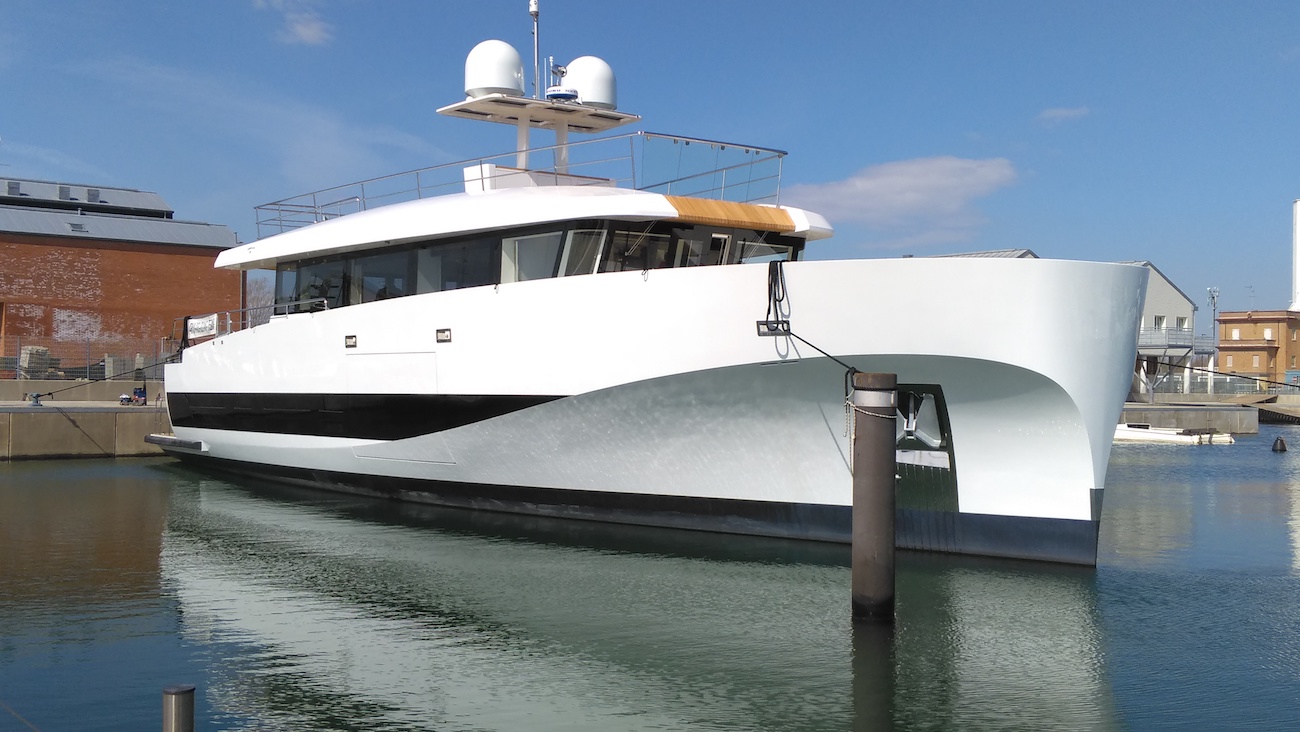 The main living area is of a generous size, as the staircase has been moved to the starboard. The interior design is elegant, with soft tones of fabrics, oaks and white and red lacquer elements. The wheelhouse, however, boasts Makassar ebony and dark tones of leather, completely different from the rest of the interior.