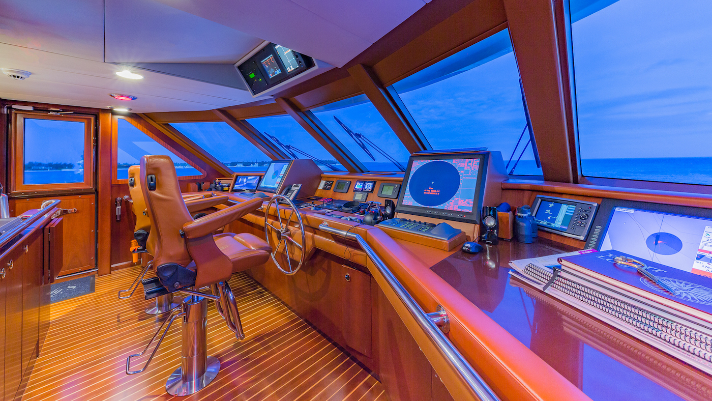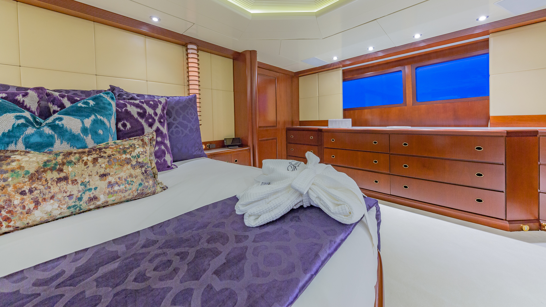 The sundeck comes with a forward wet bar and barbeque which serve guests resting on the sun loungers with adjustable headrests immediately behind, or the four inward-facing corner sofas and that each have a drinks table for intimate conversations among the whole group. There is a 32" widescreen TV for films and live sports, and the Jacuzzi along the stern is a desirable place to let cares drift away through daylight hours or on sparkling moonlit nights.