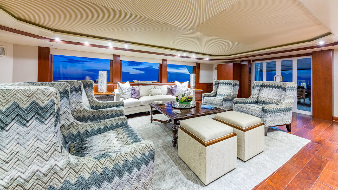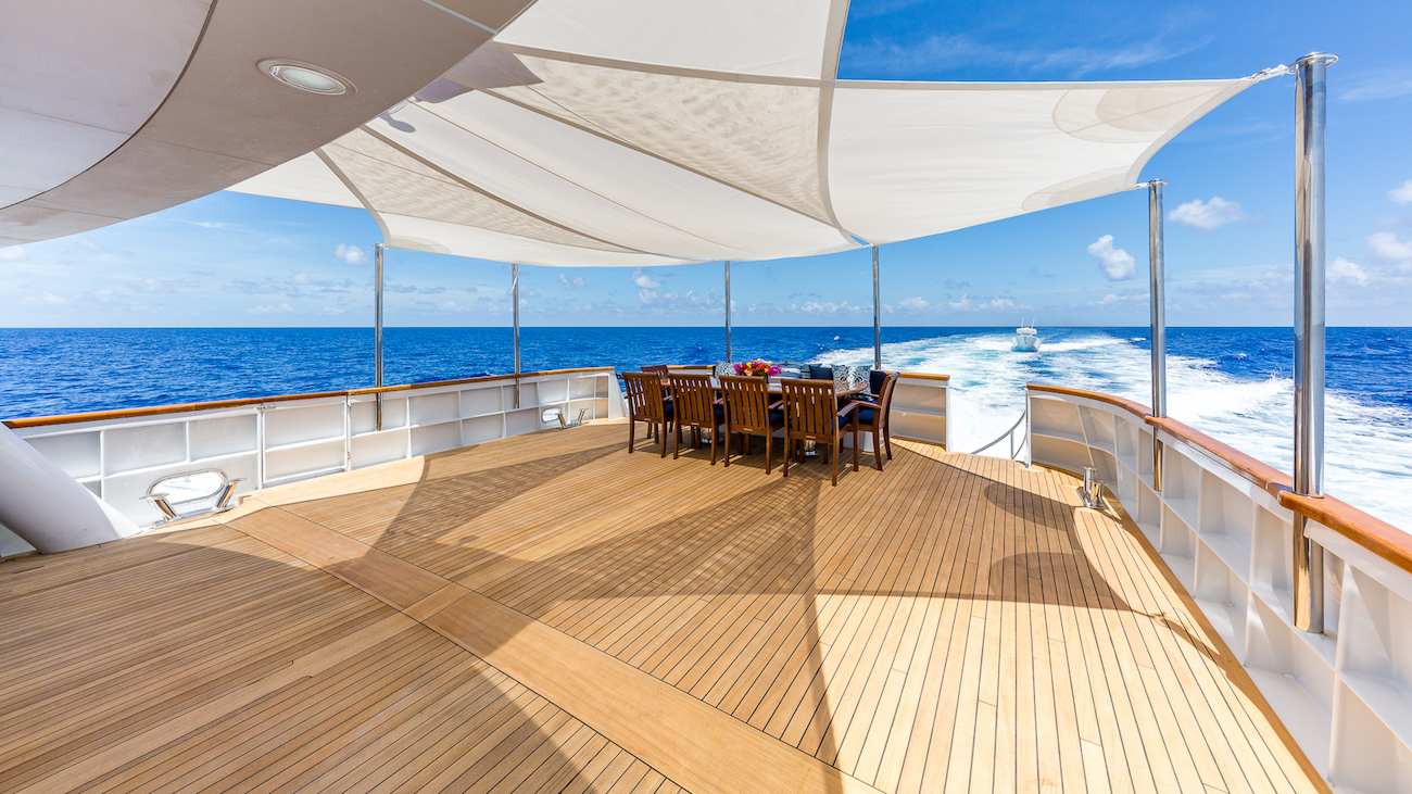 Luxury yacht LADY S is adaptable to local weather conditions: Both the main deck aft and sundeck can be covered by a canvas shade, while the upper deck has surroundings screens for use even in wet or windy weather. The main deck aft offers a large aft alfresco dining area, where the plush sofa along the stern an elevated table creates an ideal place to unwind with hobbies or the latest bestsellers.