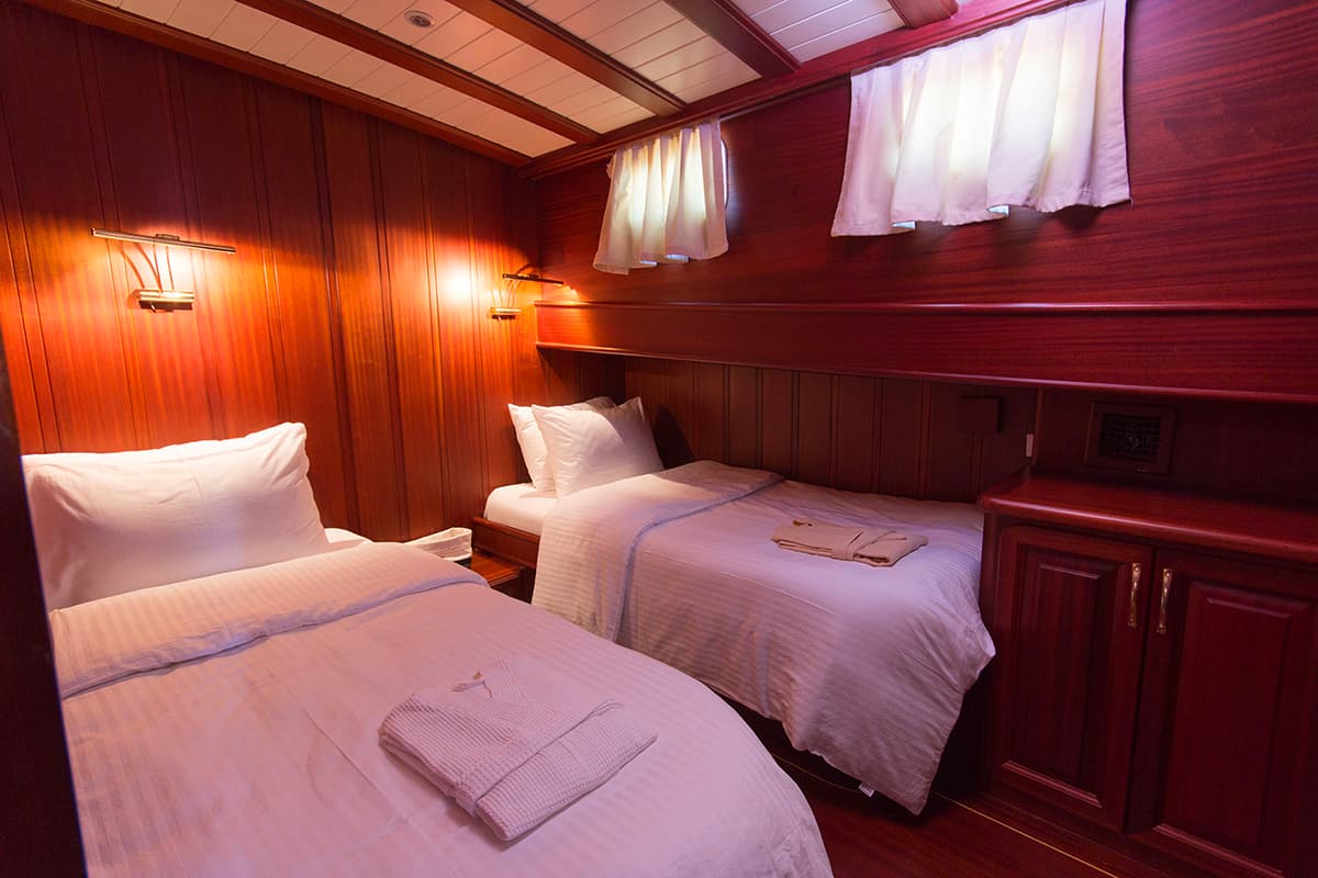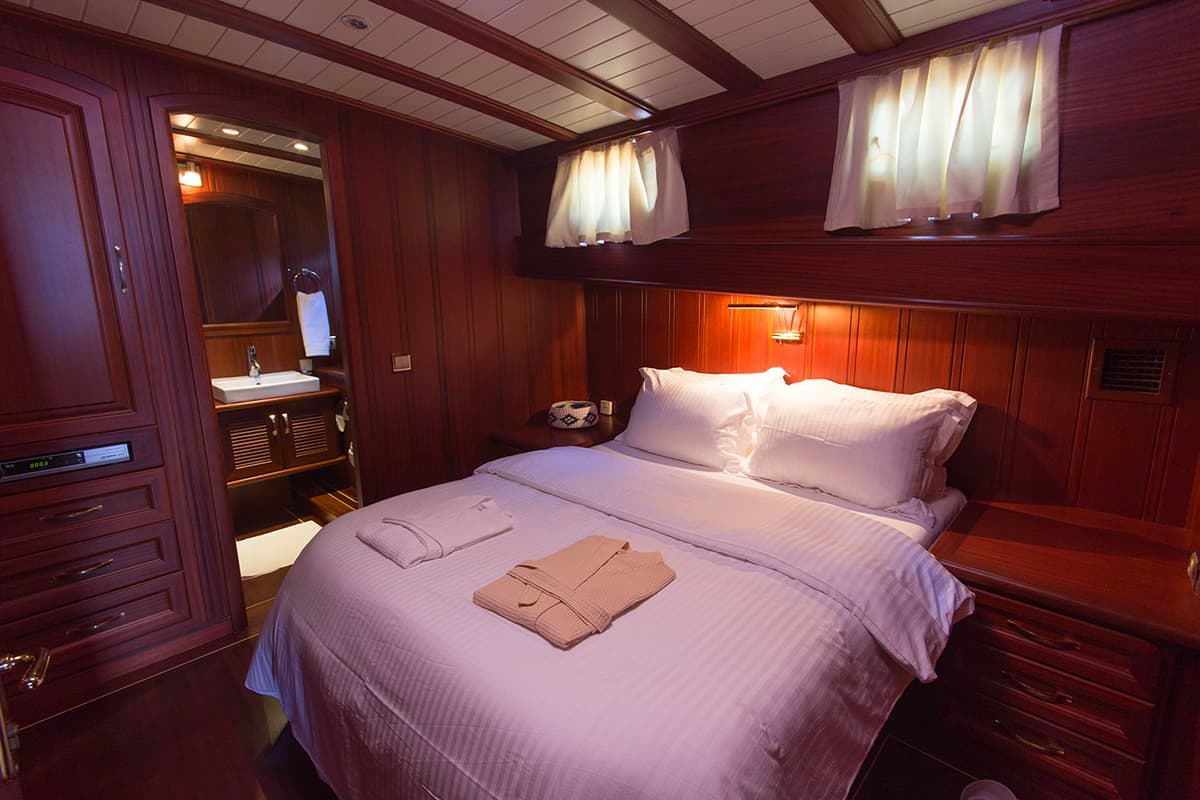 The same timeless wooden panelling used in the salon can be found in the guest cabins, creating a comfortable and cosy environment for a sound night’s rest. Each cabin comes equipped with a mini bar along with air conditioning, and the en-suite bathrooms have hairdryers along with the essentials of a sink, toilet and shower.