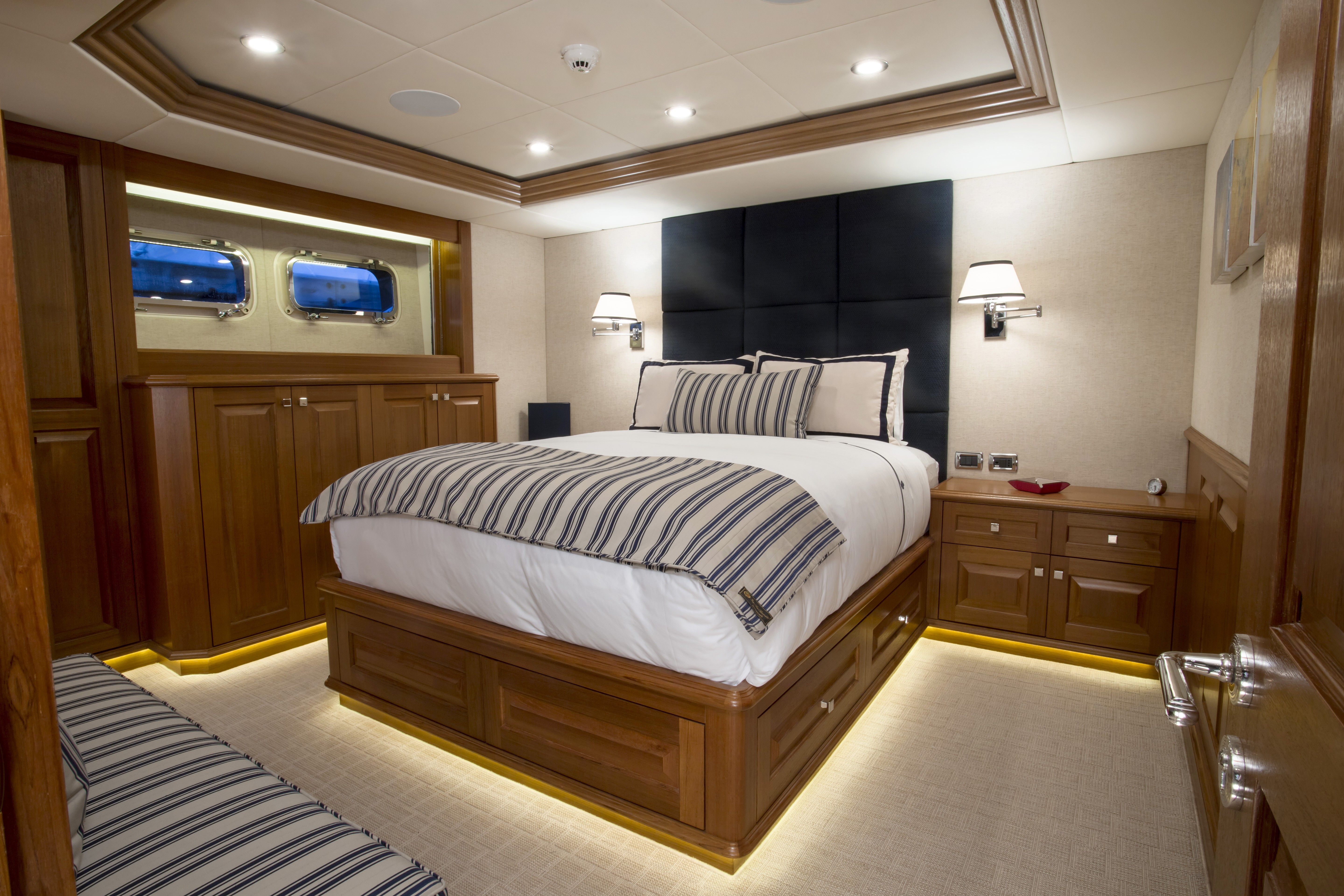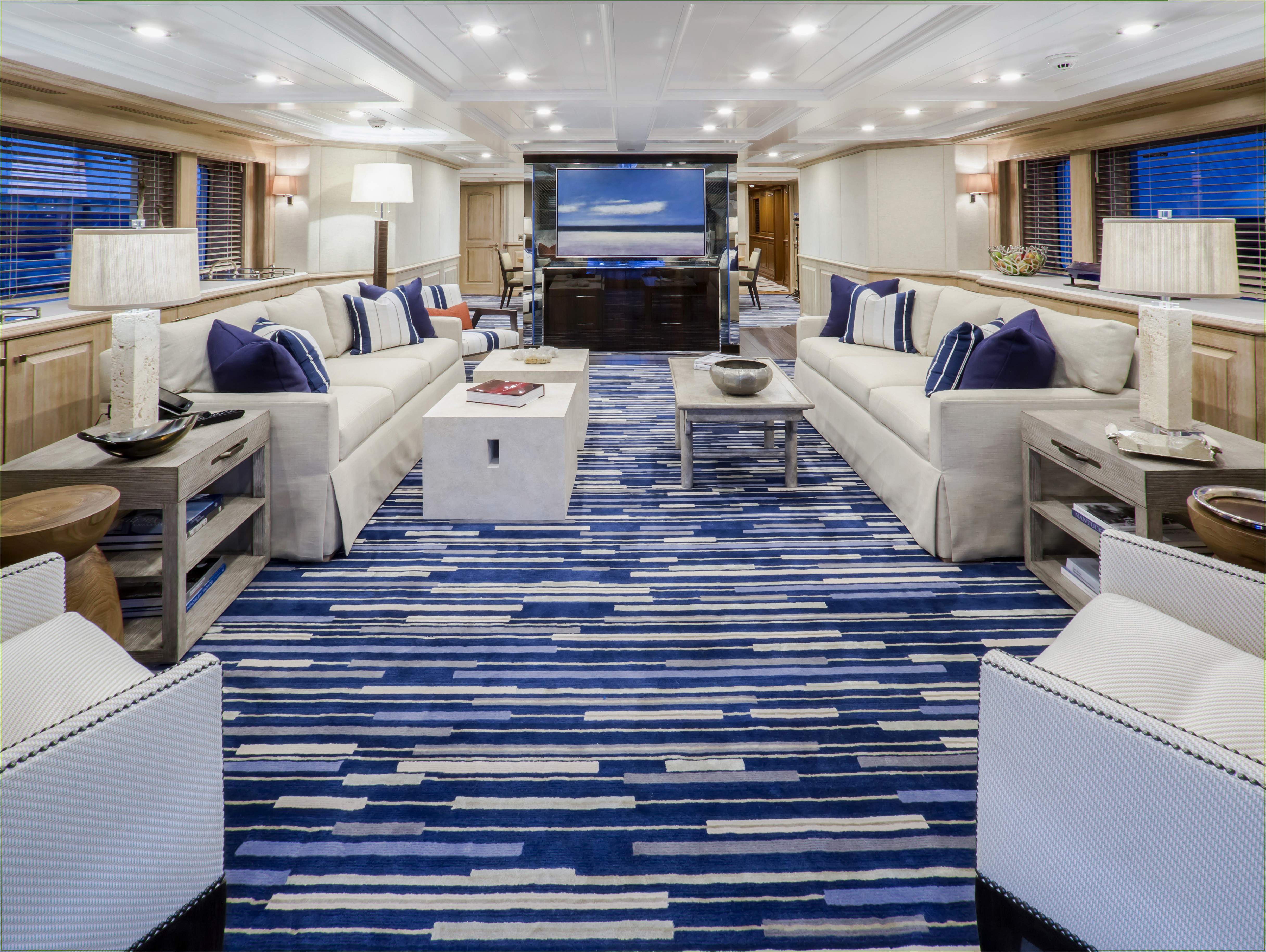 BLU470 has opulent accommodation comprising of a master suite, three double cabins and one convertible twin cabin. Carpets and upholstery are in blue, cream and grey stripes, very soothing, relaxing colours. In the master suite which is on the main deck, a private office with captivating views can be used to keep in touch with family back home. There are also a his and hers bathrooms, so lots of space to keep personal toiletries.