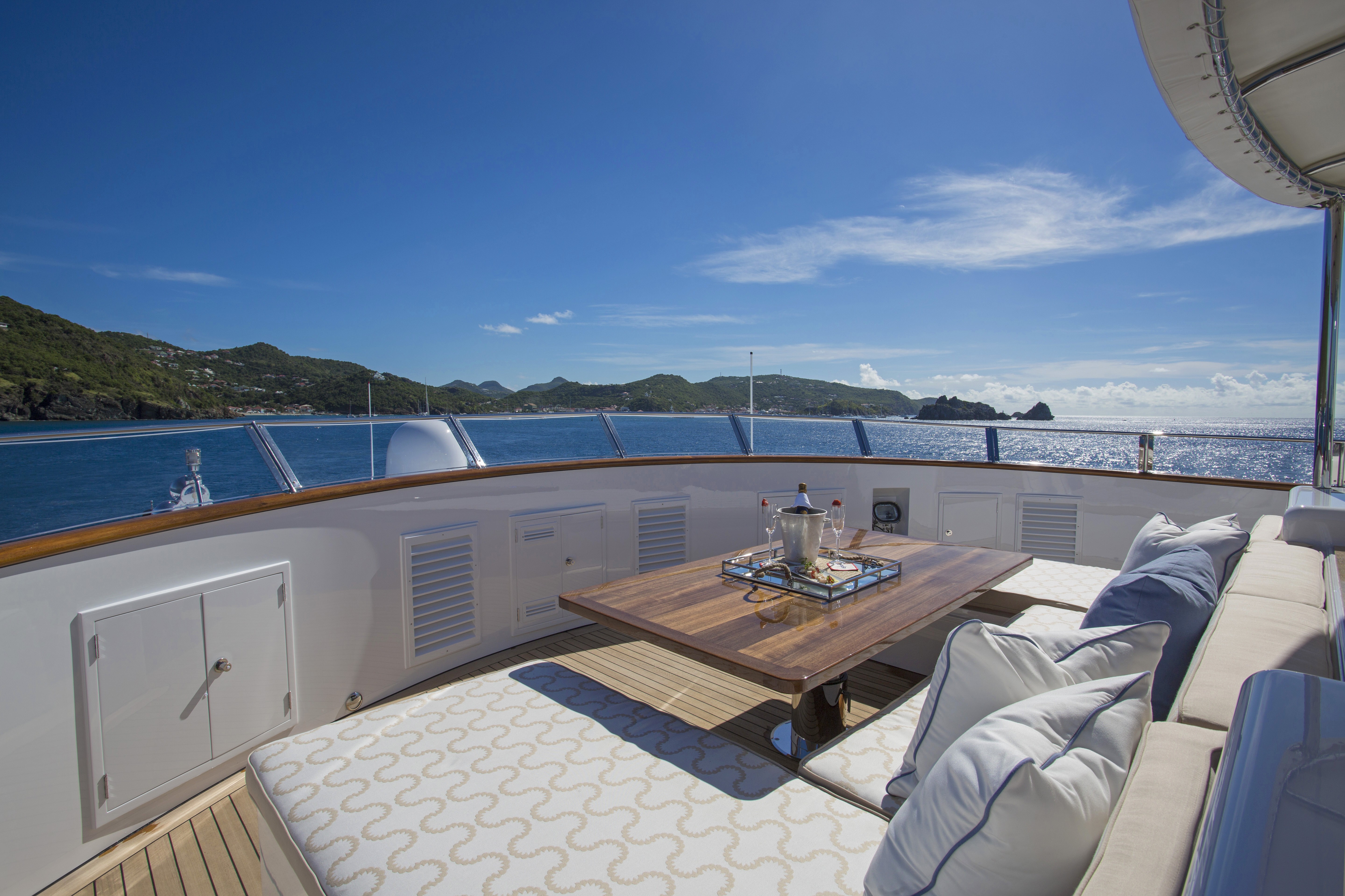 All exterior areas have been updated too with casual seating and a wet bar on the main aft deck. The upper deck is always the heart of luxury superyachts where you’ll see a fabulous al fresco dining area as you step out of the sky lounge. The sundeck above provides a shaded area on this deck, ideal for socialising, having a quiet drink or relaxing under one of the large parasols.
