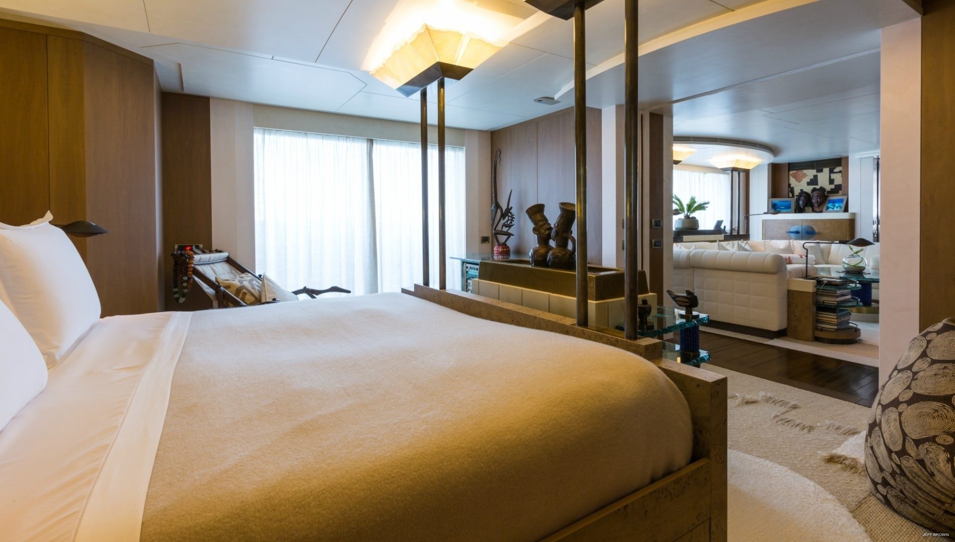 You won’t fail to be impressed by these colourful artwork pieces that are set alongside a neutral colour of brown wood and pale, soft furnishings. There’s almost an organic feel especially when the overall look is reminiscent of a luxury African safari lodge. As a point of note the beach house style décor is now very popular among today’s new superyacht launches.
