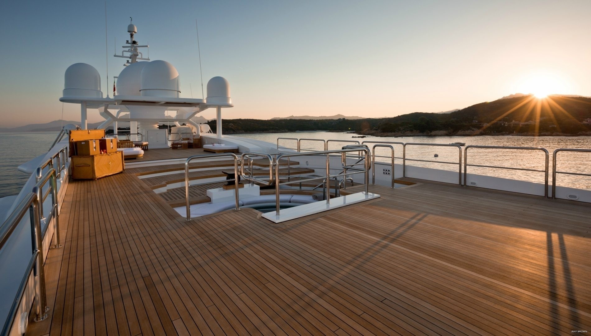 One of the first things you will notice when stepping on board is that this yacht doesn’t comply with the layout of other superyachts. What is usually an al fresco lounge on the main deck aft has been utilised as a storage area for two of the vessel’s tenders. One is a specially built 8.6m limousine while the other comprises of two jet skis. The main aft deck can quite easily hold parties for up to 80 guests when this space is cleared.