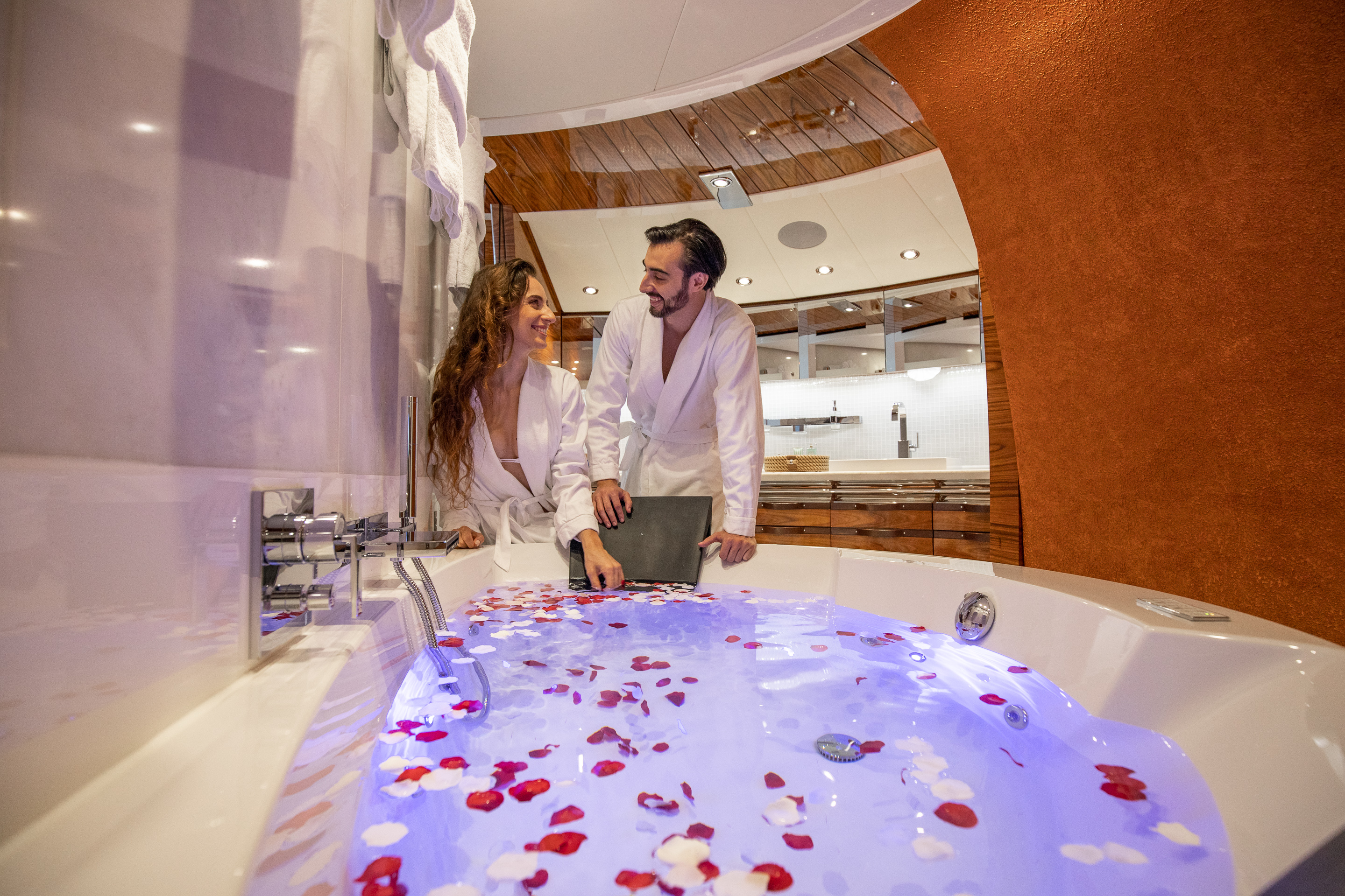 For those who prefer to exercise off the water, there is a selection of gym equipment; and for movie buffs and TV addicts there are screens throughout which can access the onboard movie server and subscription TV services.