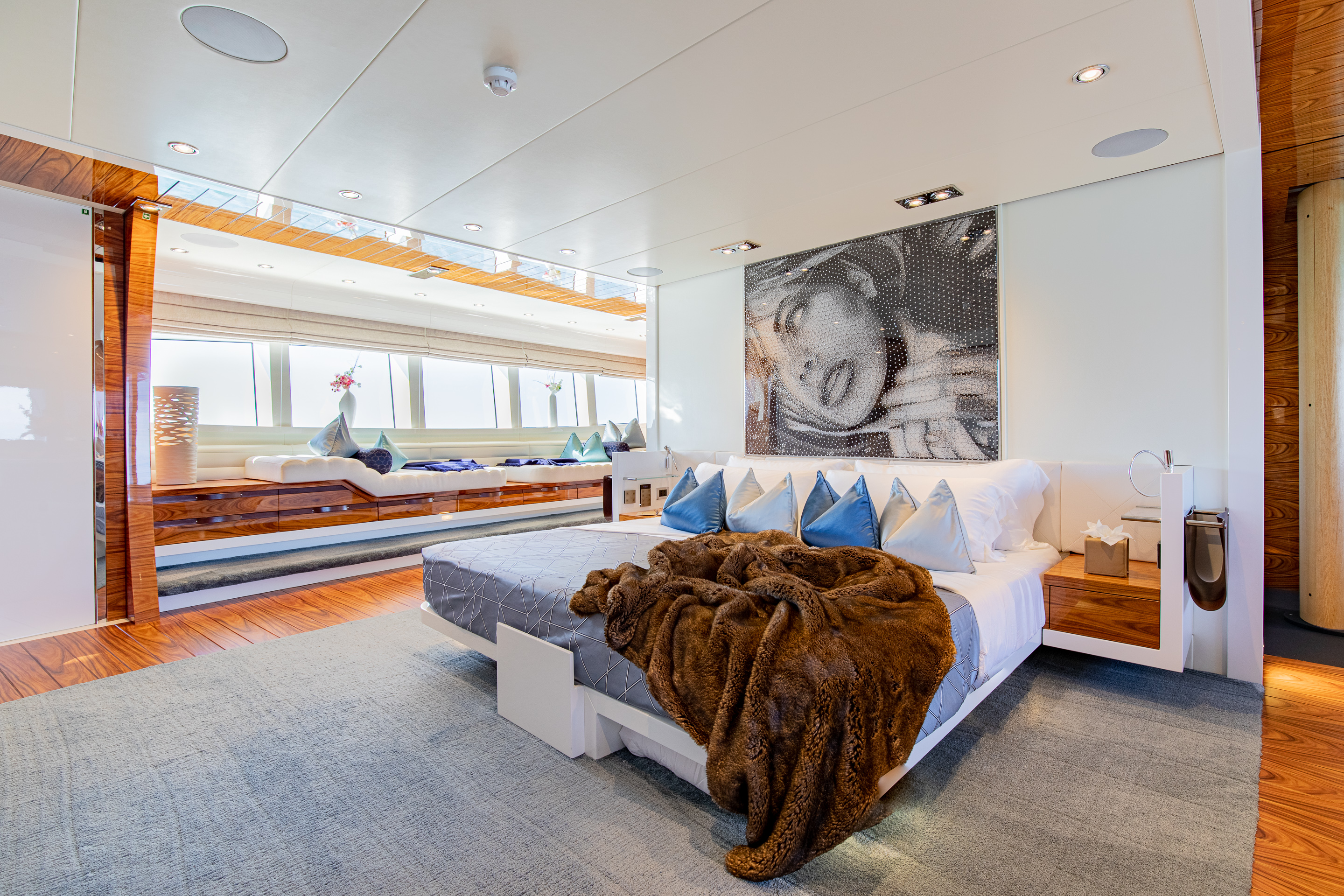 Guests can be entertained for al fresco dinners on the upper deck or for drinks on the main deck aft from where steps descend to the swim platform, also a launchpad for the huge array of water toys. As a registered RYA training centre, guests can pass their watercraft certification while on board to make full use of the jet skis.