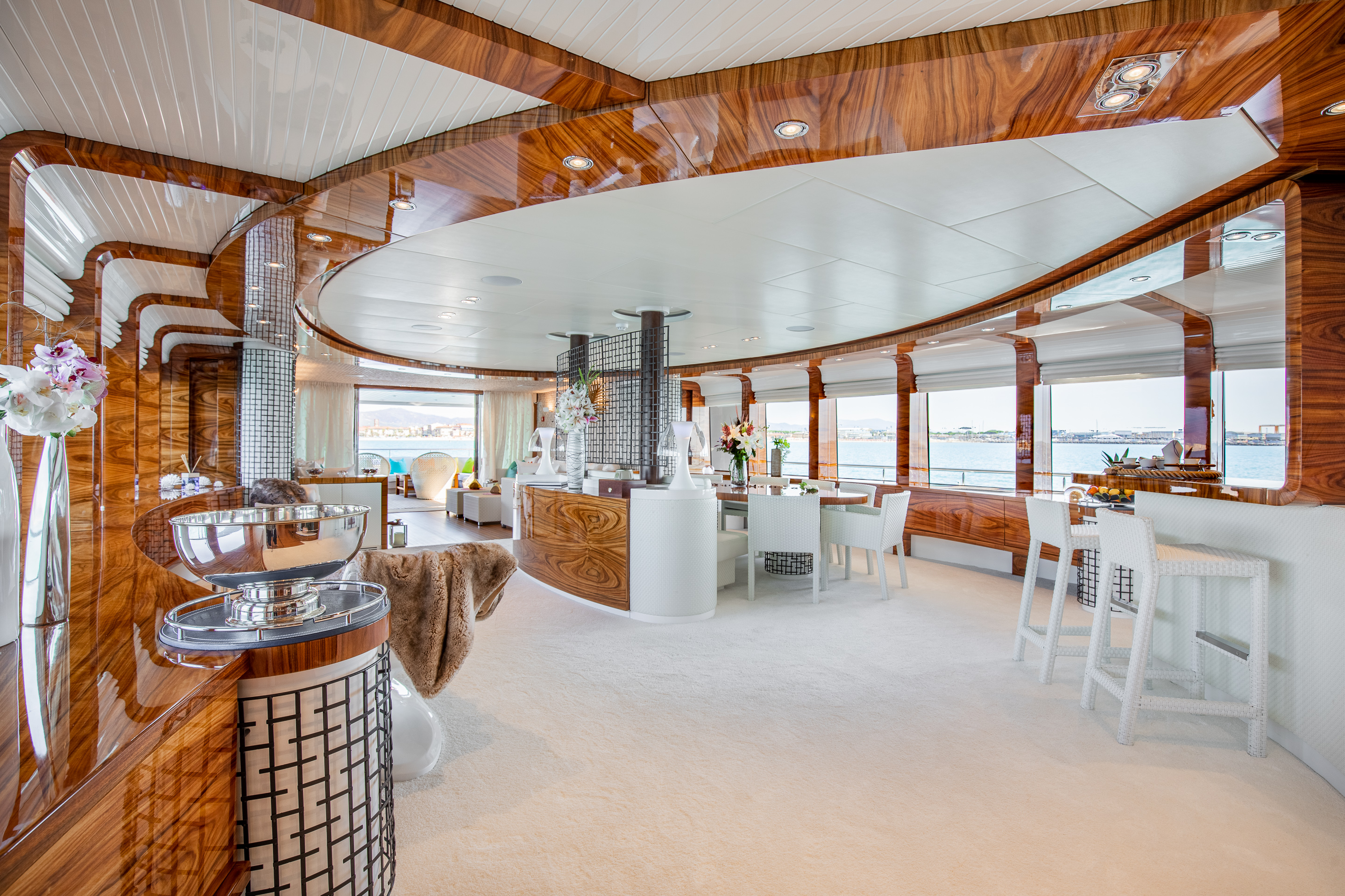 Following her 2021 refit, visitors are consistently in awe once they step inside the two salons: both distinctive in their style and atmosphere. The bright colours seen on the deck soft furnishings are echoed across the interior décor and texture; pattern and beautiful fabrics add further depth and warmth. The main salon is defined by the impressive oval feature ceiling, a shape which can also be seen in the curved dining table, designer furniture and original gloss wood cabinetry.