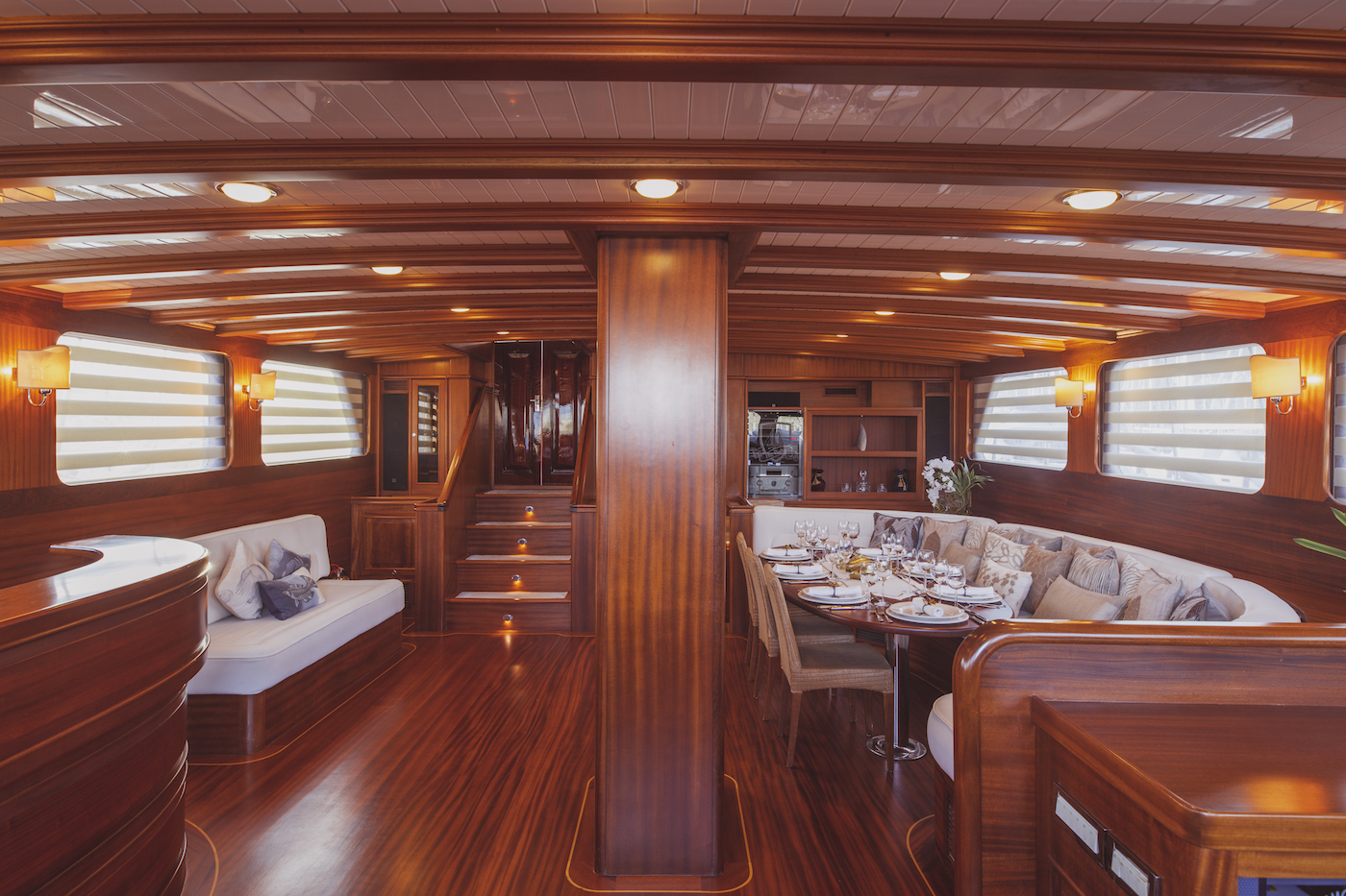 The exterior appearance of S/Y HIC SALTA is a traditional one, though benefitting from all the modern techniques and technologies to create a sturdy wooden vessel that maximises space on board. The covered aft section has a curving sofa along the stern and an elevated oval table for elegant alfresco dining, and spotlights above ensure that there is plenty of light after sundown. There is a cosy corner sofa with a table to rest books or a colourful cocktail while guests admire the passing scenery on a cruise to the next location.
