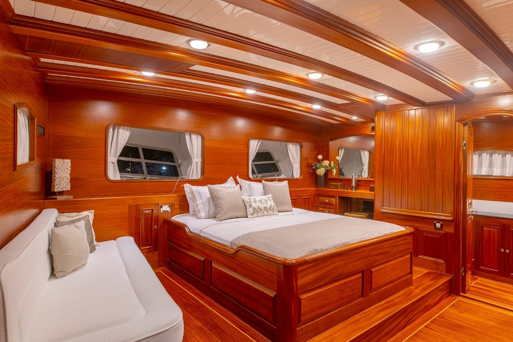 The rich mahogany interiors continue through to the guest accommodation, which is forward and aft of the salon and designed to sleep up to 10 guests across 5 en-suite cabins: 1 Master suite, 2 VIP staterooms and 2 twin cabins.