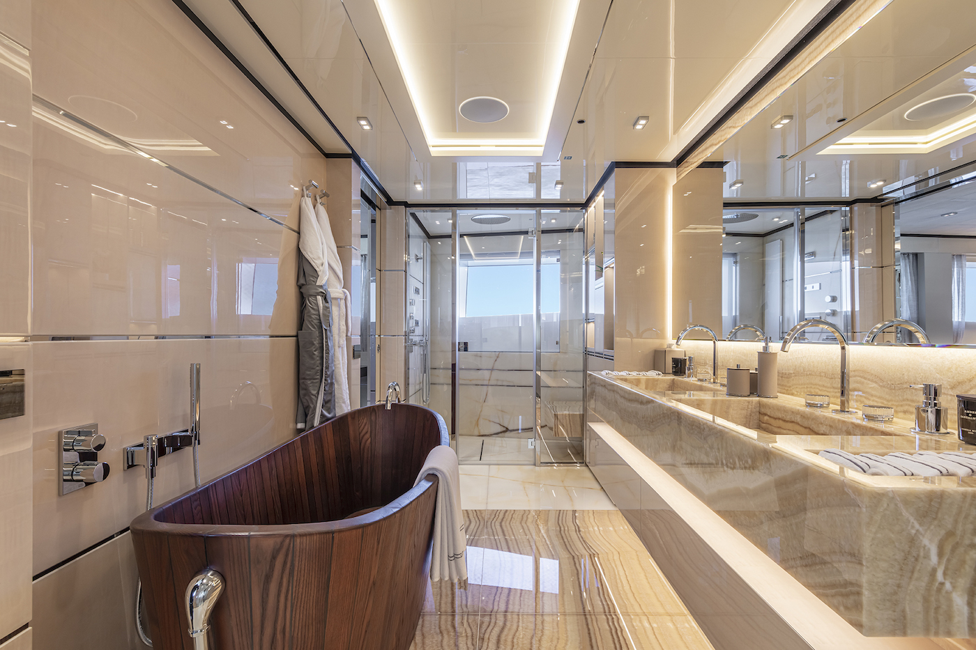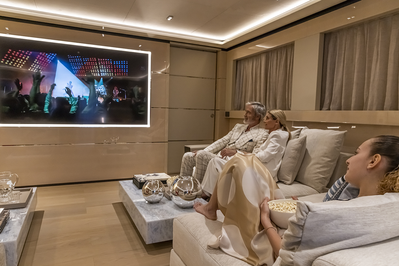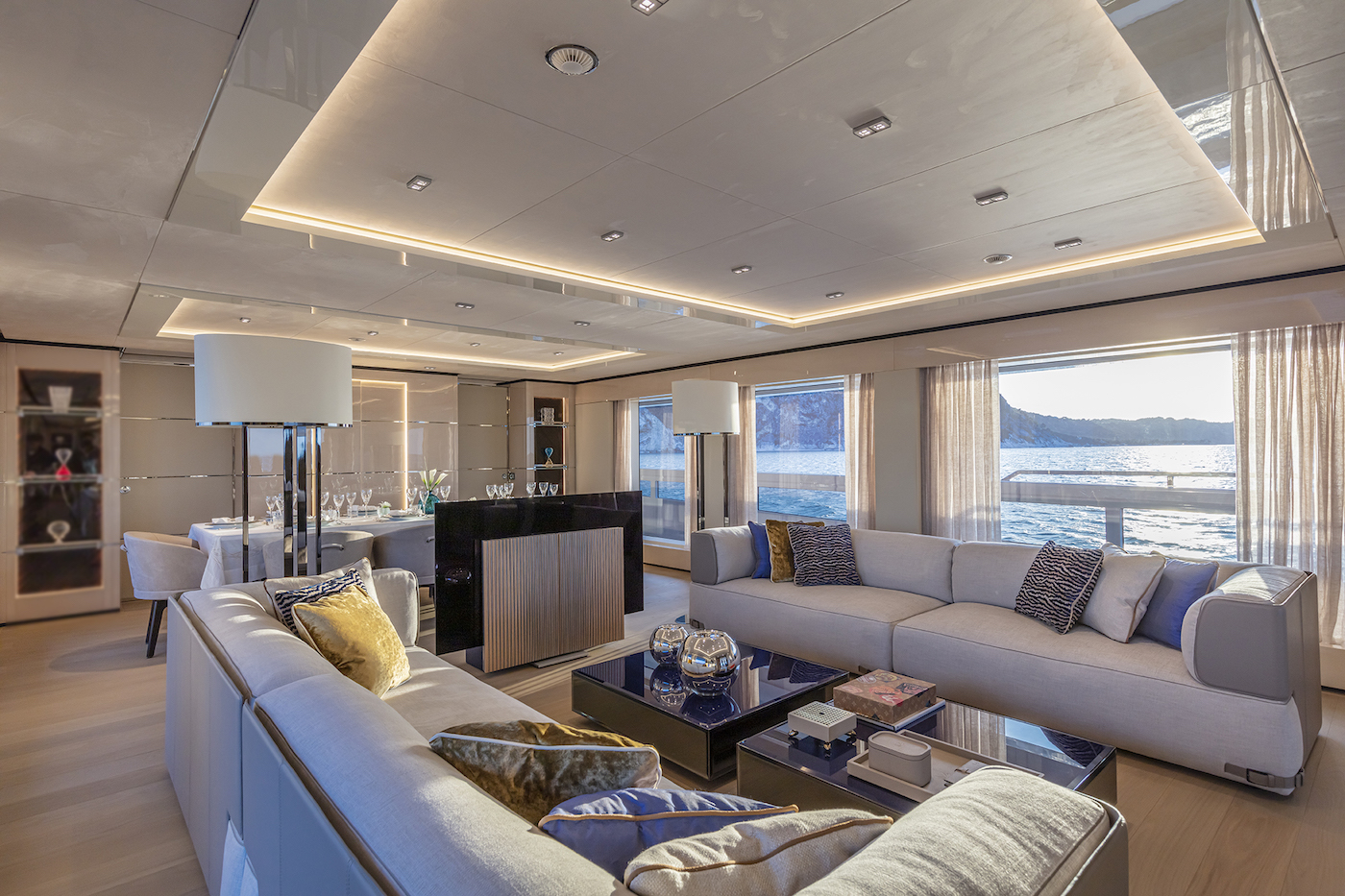 The main salon and formal dining area are combined into one large free-flowing space, with the formal dining area seating up to 10 guests in an airy setting with seating designed for practicality and comfort. Guests can choose to rest on the sofas within the main salon, or head upstairs to the skylounge for convivial conversation and card games beside the bar. As the evening draws in, the skylounge becomes a cinema where guests can lie back, relax and watch the latest blockbusters in high definition.
