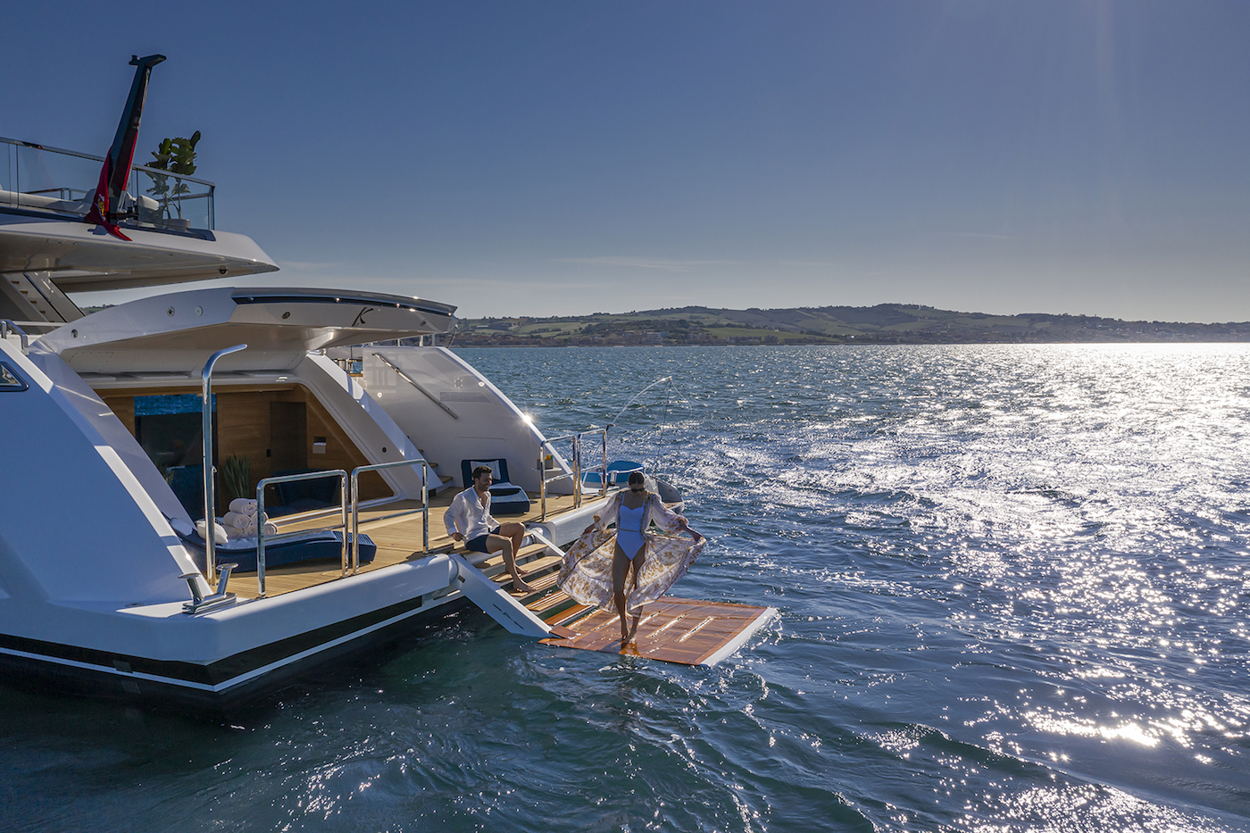 Life outdoors couldn’t be better than the versatile spaces aboard M/Y K2: The main deck aft is an extension of the main salon with its wet bar and selection of furnishings for lounging in the shade. There is easy access to the lower deck beach club and the broad swim platform, which is deep enough for a pair of sun loungers while leaving enough space to access the fold-out platform into the sea.