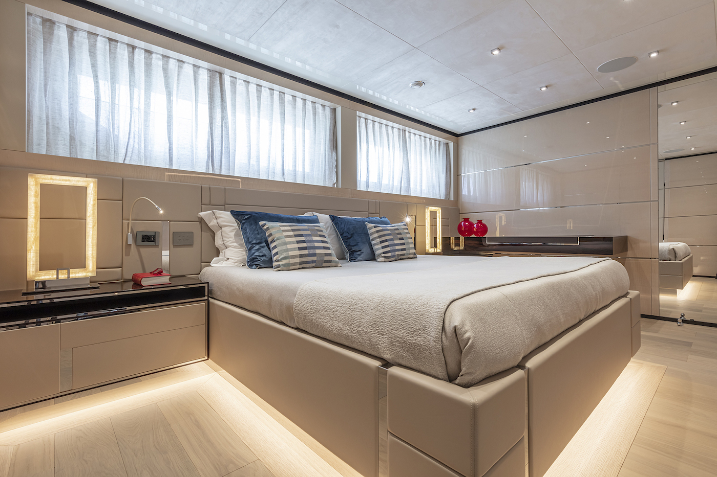The fresh and light interior styling of the social areas continues into the private quarters, which accommodate up to 11 guests over 5 en-suite cabins: 1 Master suite, 3 double cabins and 1 twin cabin with a Pullman berth.