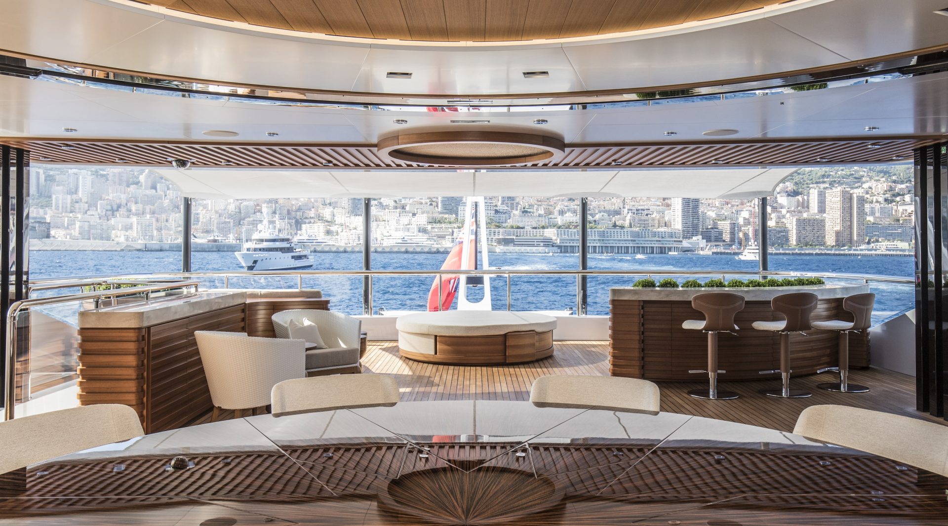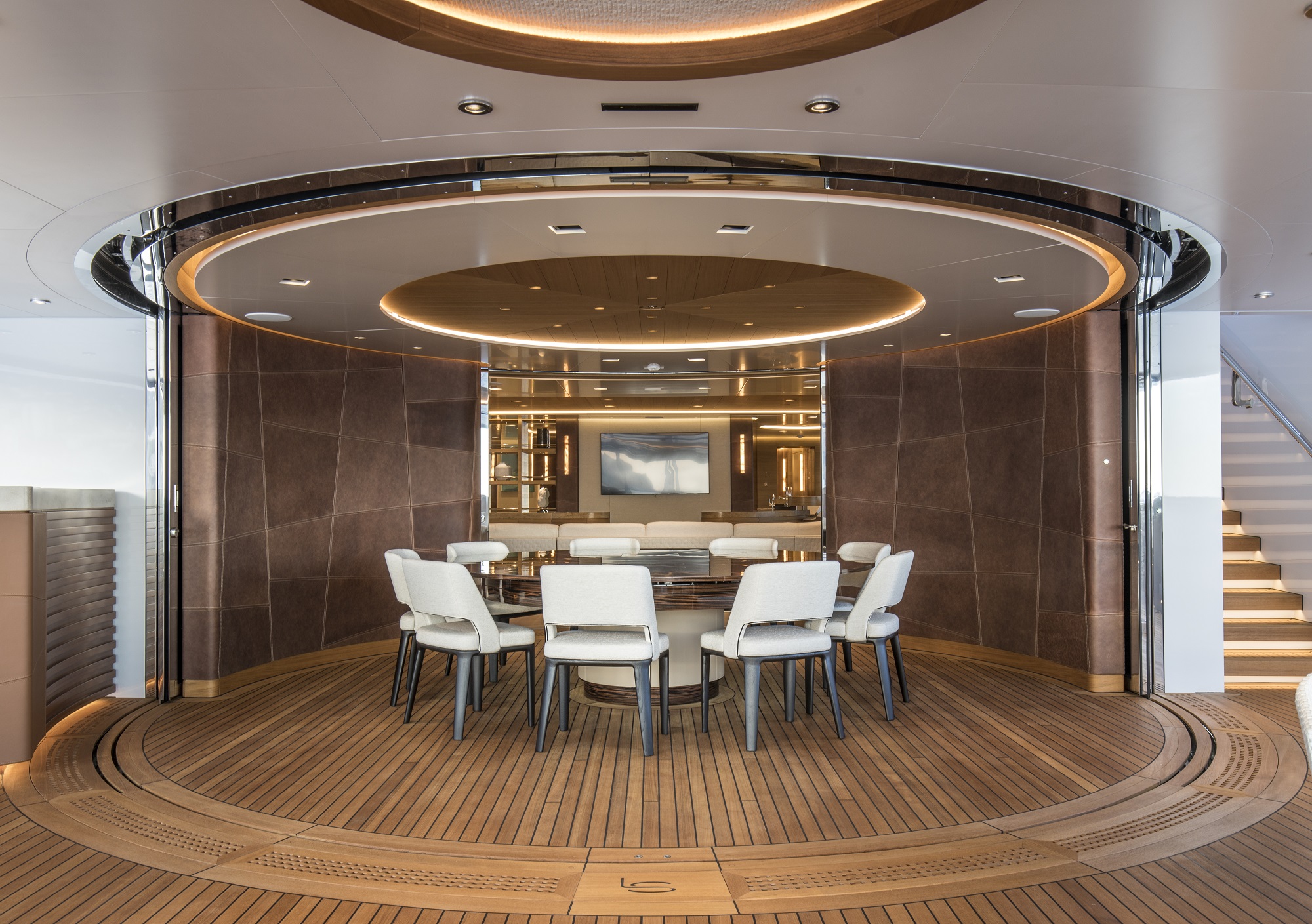 The upper deck aft has a circular dining table in the skylounge that can be outdoors or surrounded by glass for use even in colder seasons. Diners will be served by the port side wet bar, and the conversation can continue long into the night on the sumptuous sofas.