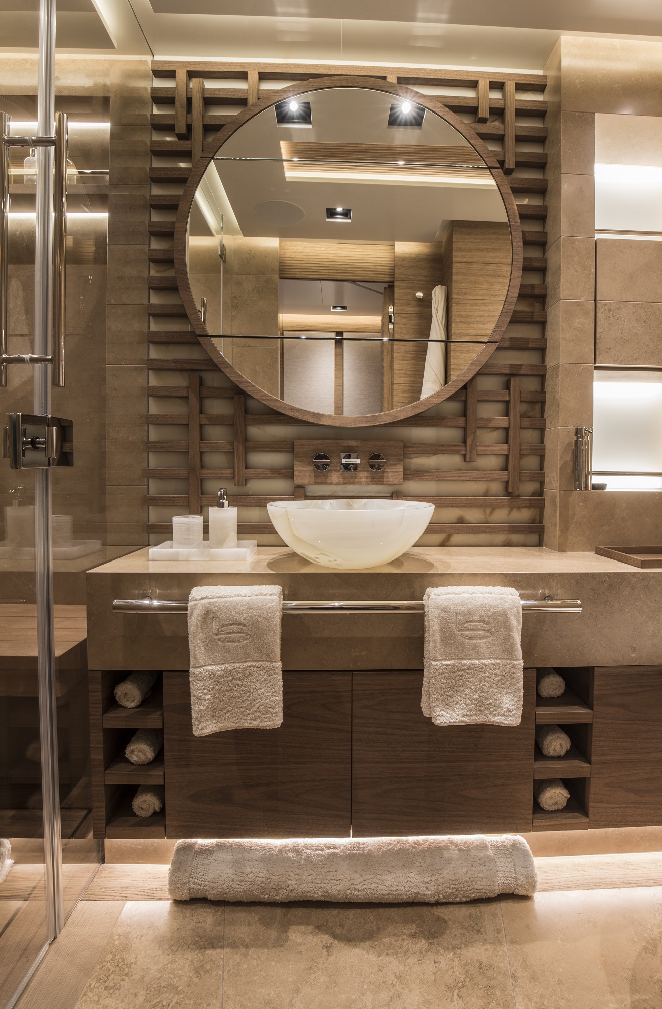 The warm natural colour scheme continues from the floor to the ceiling with plenty of oak used throughout, accompanied by darker walnut and wenge for contrast. Instead of relying on high gloss lacquers, the natural beauty of each material is brought out with a brushed finish that highlights the texture and grain. Lines are an important element in directing attention throughout the open plan interiors and take inspiration from Japanese design, and orchids and other hydroponic plants add a homely ambiance while keeping with the organic theme. Travertine, sunset onyx and emperador marble finish the high quality interiors in the en-suite bathrooms, and guests with a good eye will spot these materials finishing off the edges around the main salon wet bar and similar places.