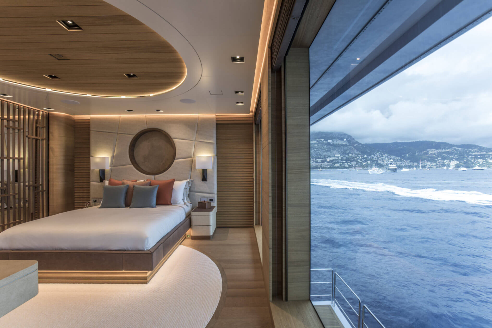 Award-winning designer Mark Berryman was in charge of creating her stunning living spaces and took into consideration the Owner’s interest in leather car interiors. As such, leather and its stitch detailing is an integral part of the surroundings, and can be found in the wall panelling, the handrail on the main staircase and even in some exterior areas where it has been treated to withstand the elements.