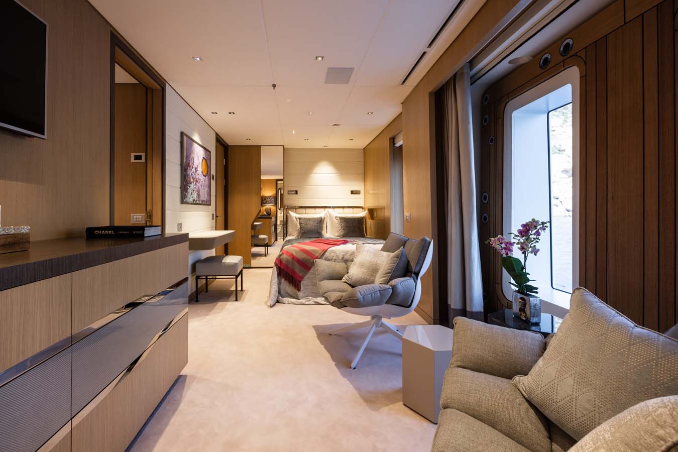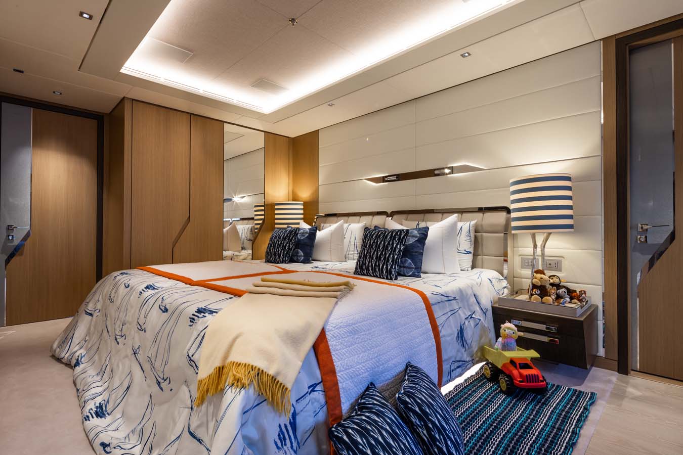 The main deck hosts a double en-suite cabin and an identical nanny cabin, within which there is also a study and attached outdoor terrace.