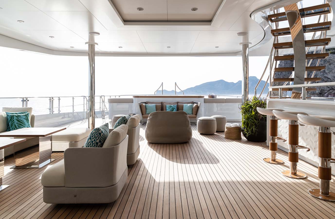 Off the skylounge, the upper deck aft comes with a circular alfresco dining table and a lounge for outdoor relaxation after a hearty three course meal prepared by the professional on board chef. Forward, there is a 55m2/592ft2 terrace for the occupants of the Master suite in addition to a touch-n-go helipad.