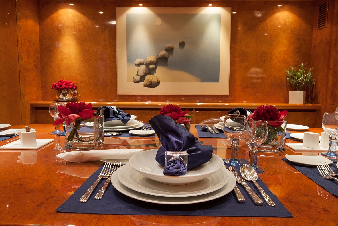 You won’t fail to be impressed by the stylish and comfortable interior. The main saloon is spacious and bright with wraparound windows for splendid panoramic views. This allows plenty of natural light to flood in making guests feel relaxed in the most beautiful surroundings. The superyacht My Way certainly has a classic style and elegance about it. The cream carpets and seating contrast well with dark glossy wood which has been used throughout the interior. Sofas are available in every room providing plenty of seating for guests. Timeless styling and eye-catching furnishings create an elegant as well as pleasant atmosphere.