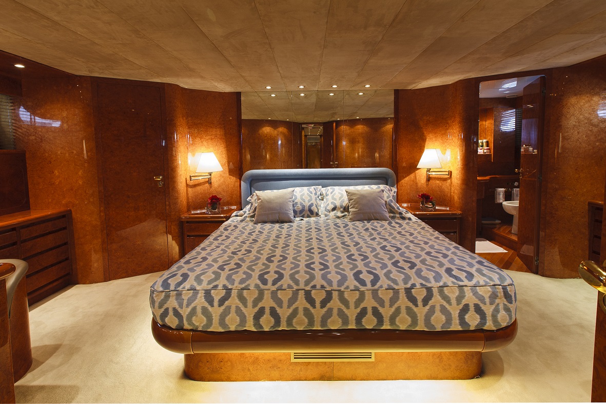 My Way has four state rooms that are situated on the lower deck. These comprise of a master, two twins and a VIP cabin, a great layout especially for family vacations. The excellent interior layout sleeps up to eight guests in four rooms. Comfort and sophistication are what you can expect when staying in the large main state room. The good-sized wardrobes provide plenty of storage for all of your outfits. There’s even a small office area in the corner of the room, just what’s needed to keep in touch with family, friends or colleagues from the office. The en suite bathroom is simply a delight with its marble fitted sink, large well-lit mirror and shower.